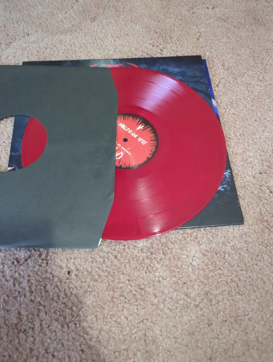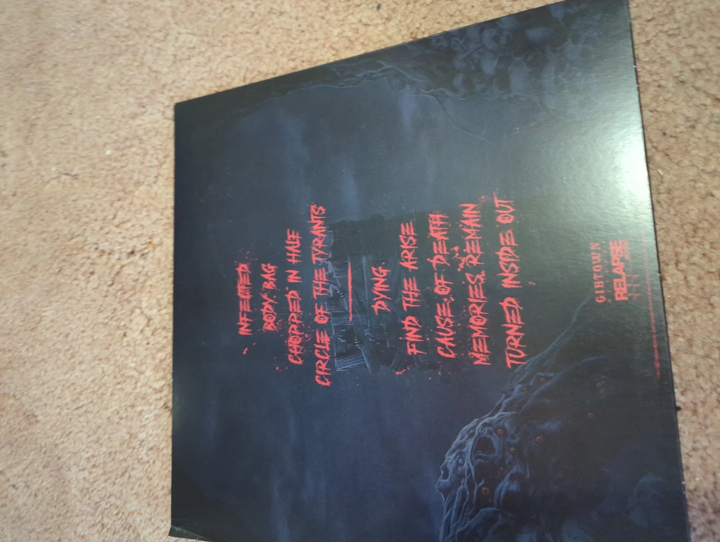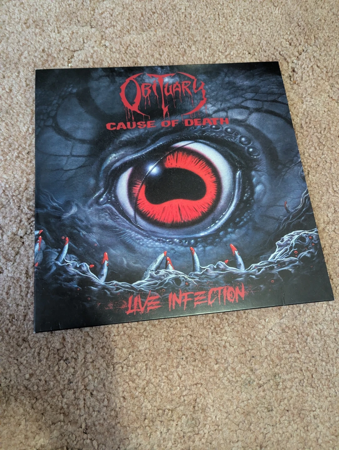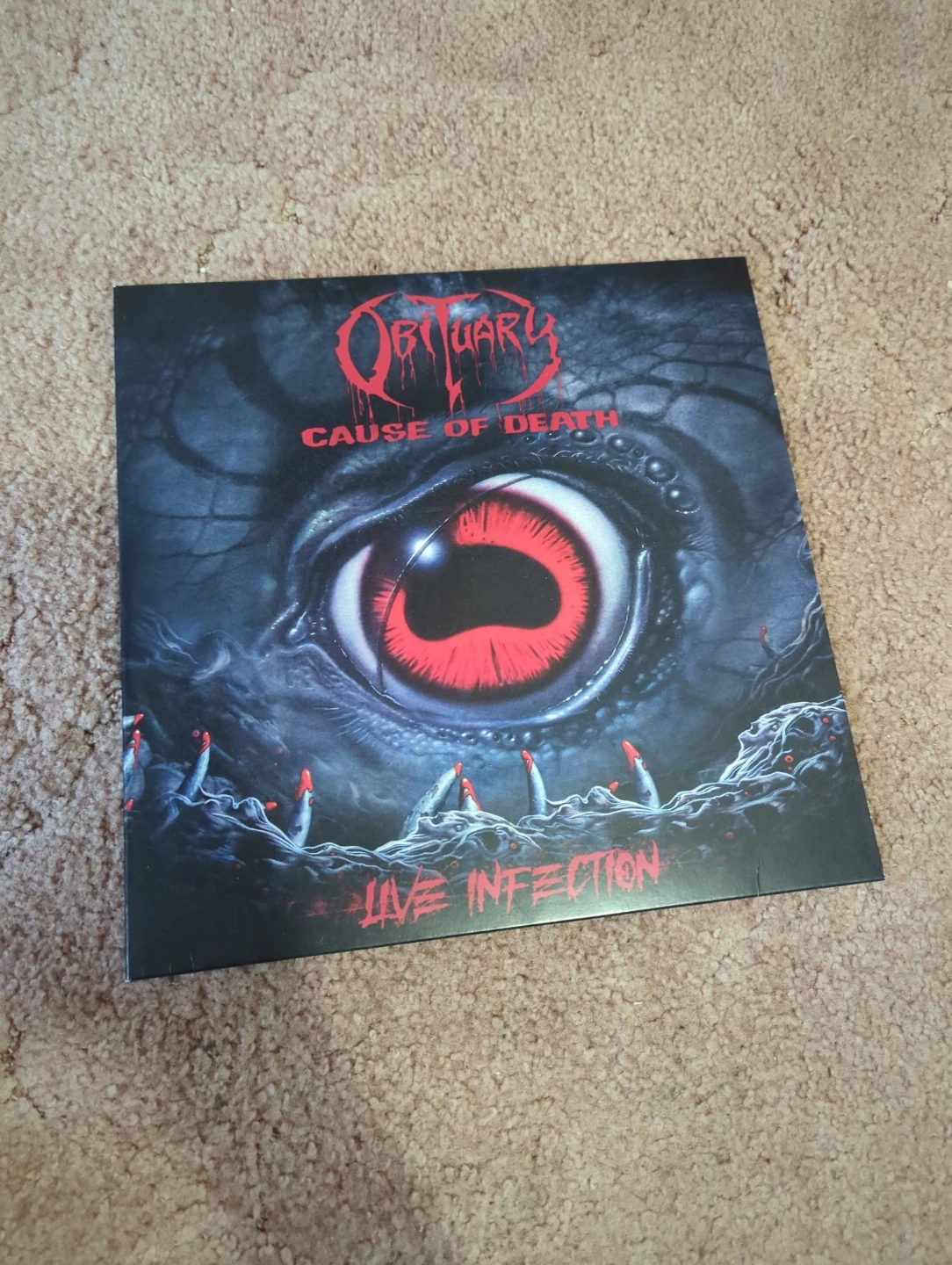 Obituary's Cause of Death Live Infection album on red vinyl. Includes the tracks: Infected, Body Bag, Chopped in Half, Circle of the Tyrants, Dying, Find the Arise, Cause of Death, Memories Remain, Turned Inside Out. Released by Relapse Records.