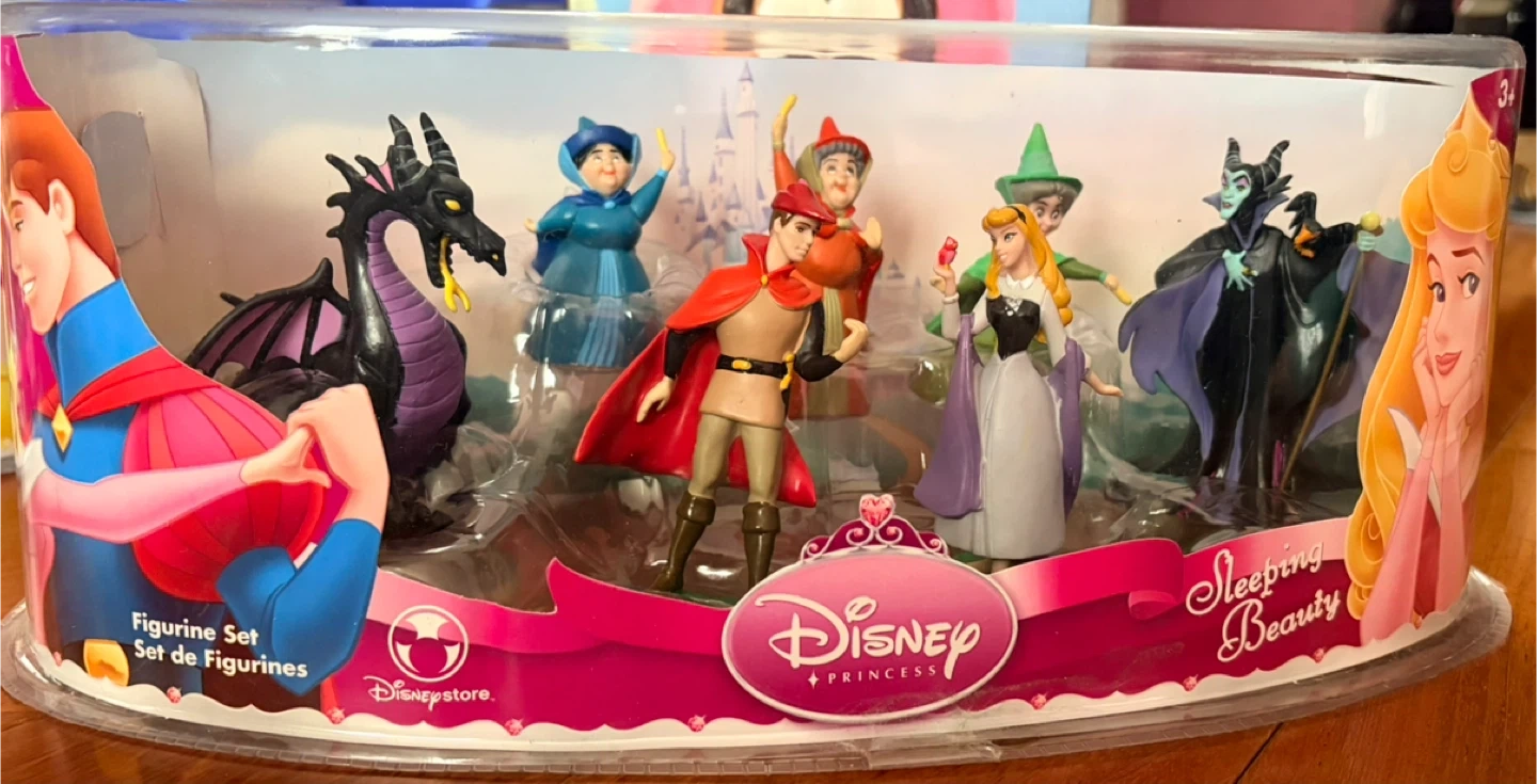 UNOPENED! This set features characters from Disney's Sleeping Beauty and Belle. Includes Aurora, Prince Phillip, Maleficent, and fairies for Sleeping Beauty. Also includes Belle, Beast, Gaston, Lumiere, Cogsworth, Mrs. Potts, and Philippe the horse for Belle. Recommended for ages 3+.