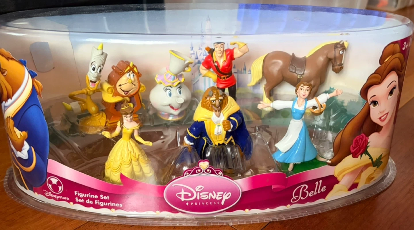 UNOPENED! This set features characters from Disney's Sleeping Beauty and Belle. Includes Aurora, Prince Phillip, Maleficent, and fairies for Sleeping Beauty. Also includes Belle, Beast, Gaston, Lumiere, Cogsworth, Mrs. Potts, and Philippe the horse for Belle. Recommended for ages 3+.