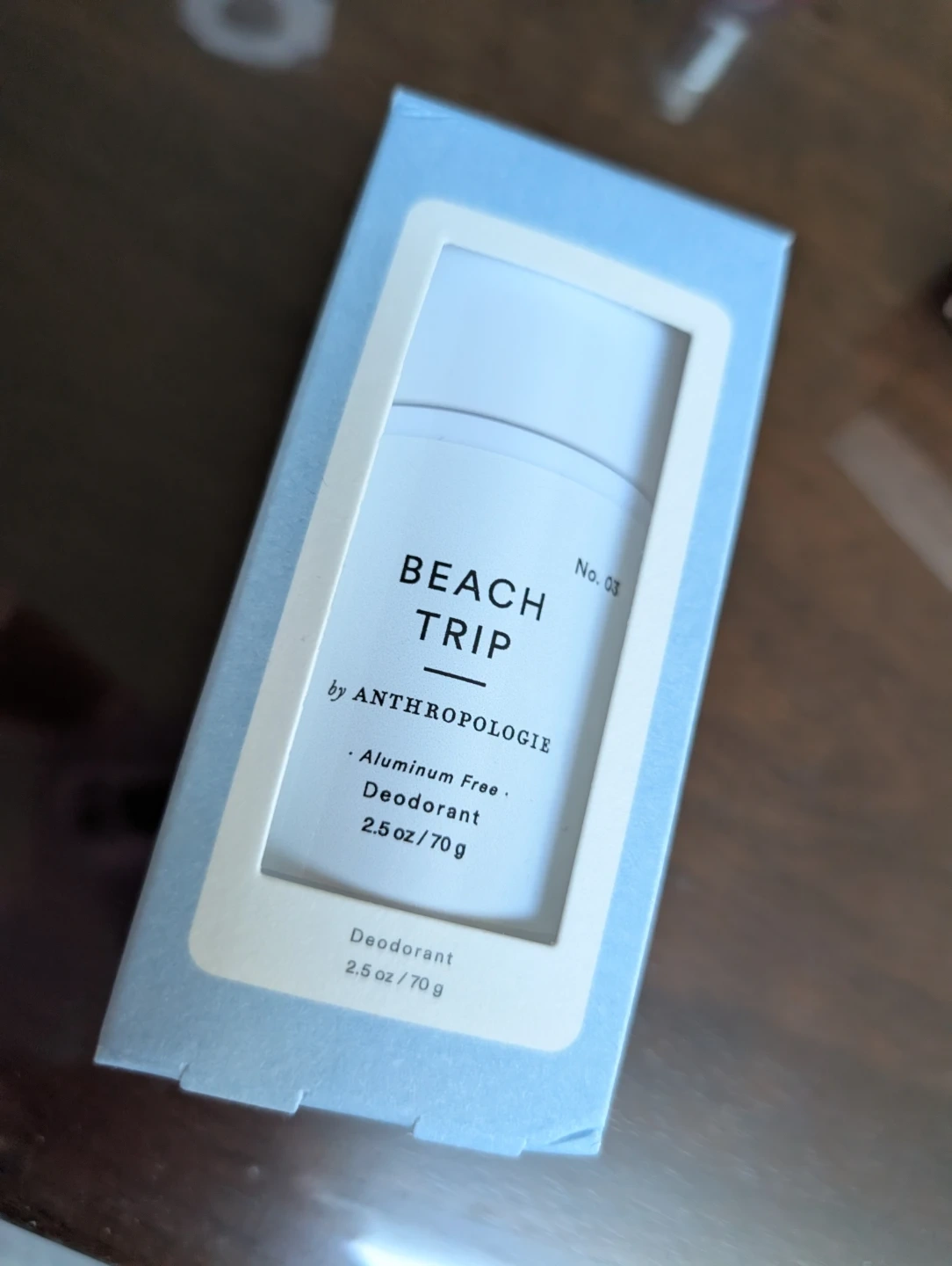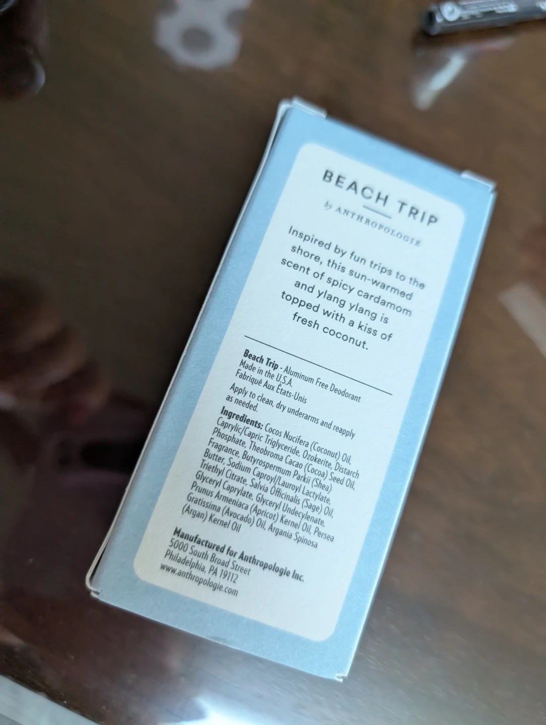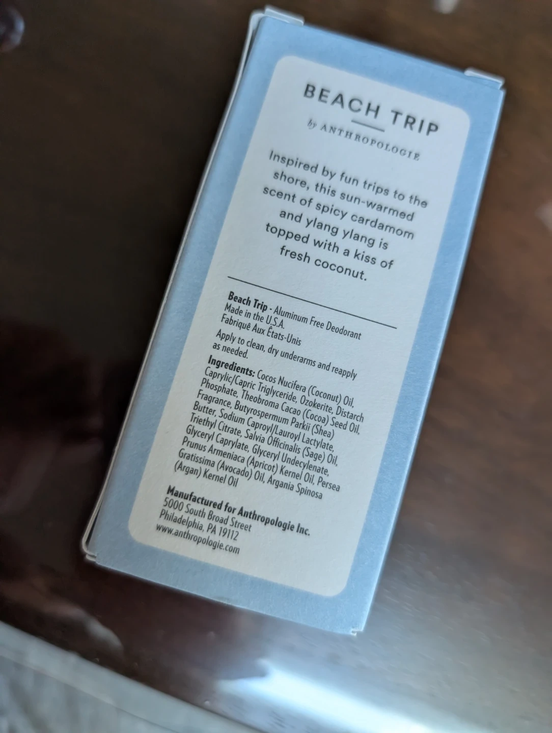 This is the Beach Trip aluminum-free deodorant by Anthropologie. It's inspired by the scent of spicy cardamom and ylang ylang with a hint of fresh coconut. The deodorant is made in the U.S.A.