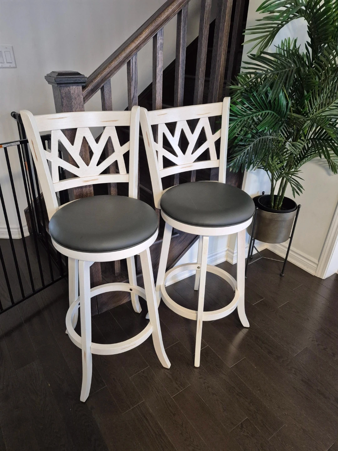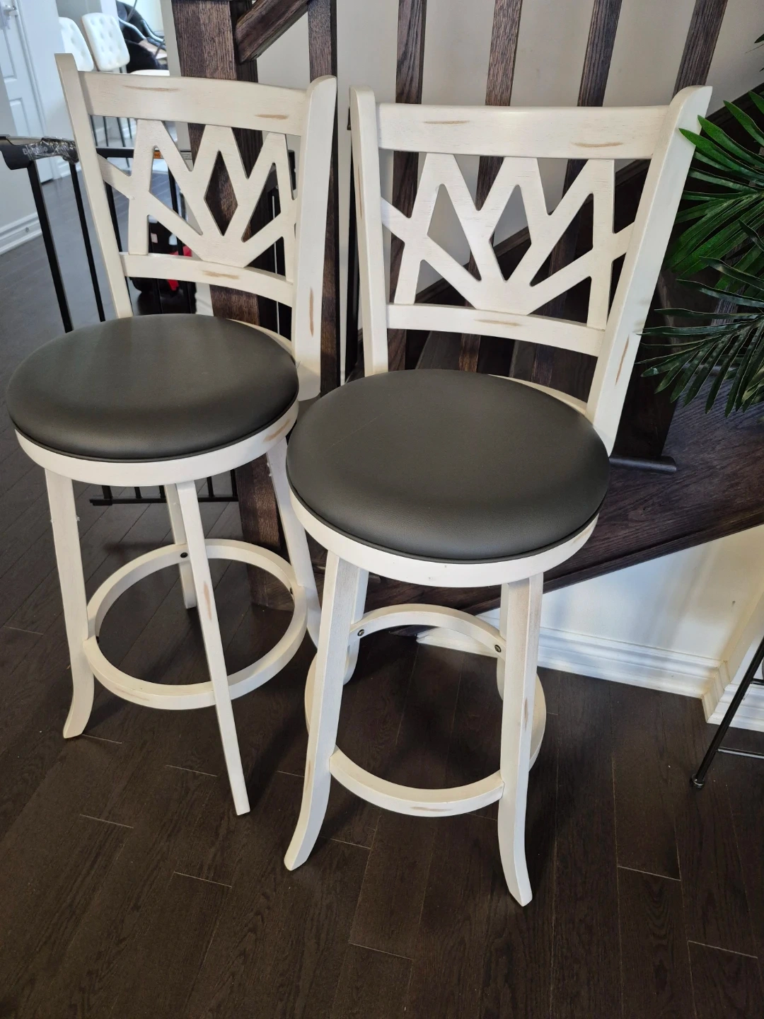 Two white swivel bar stools with dark grey upholstered seats. They have a distressed white wood finish and a decorative criss-cross backrest design. A footrest ring is built into the base.