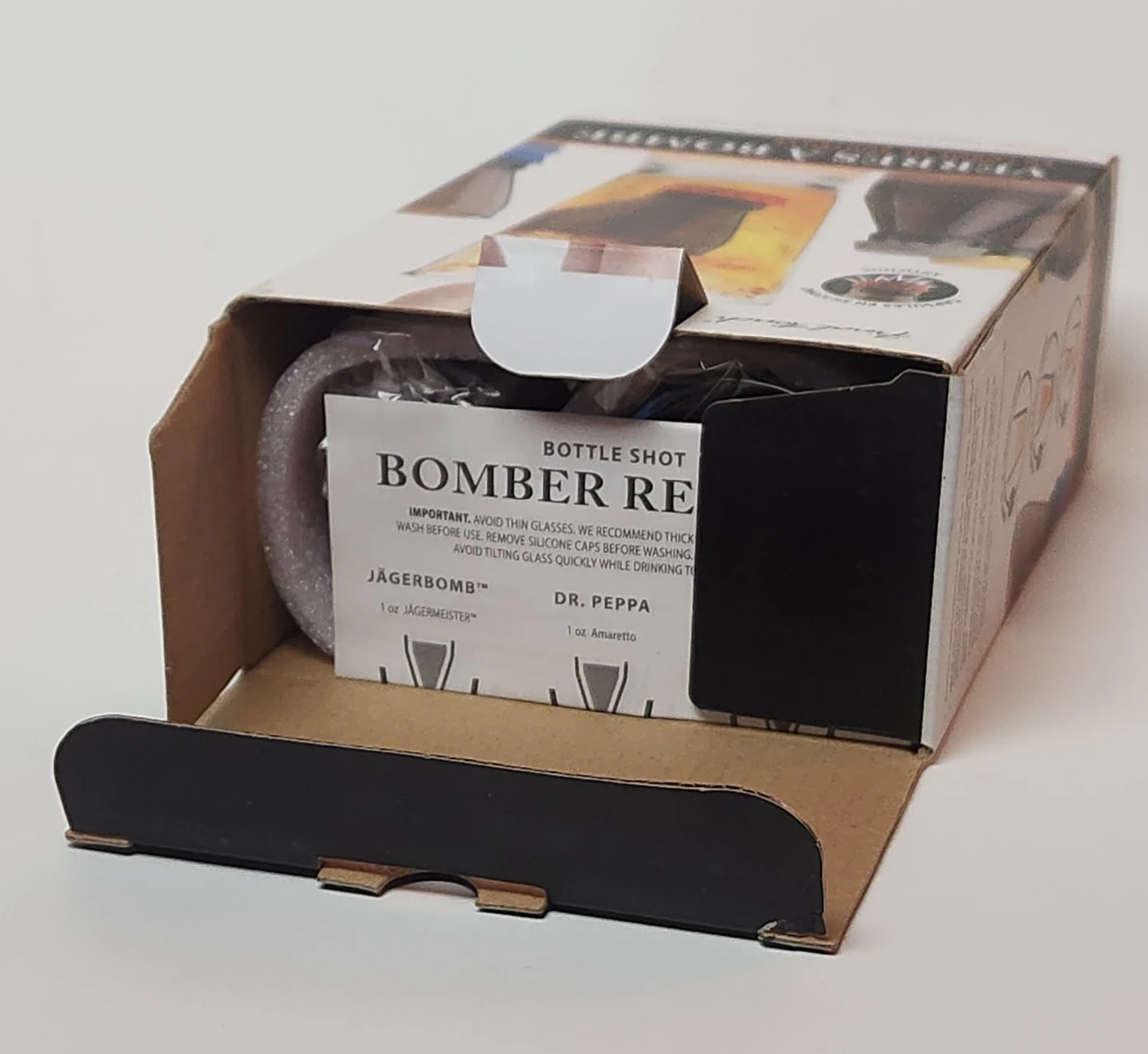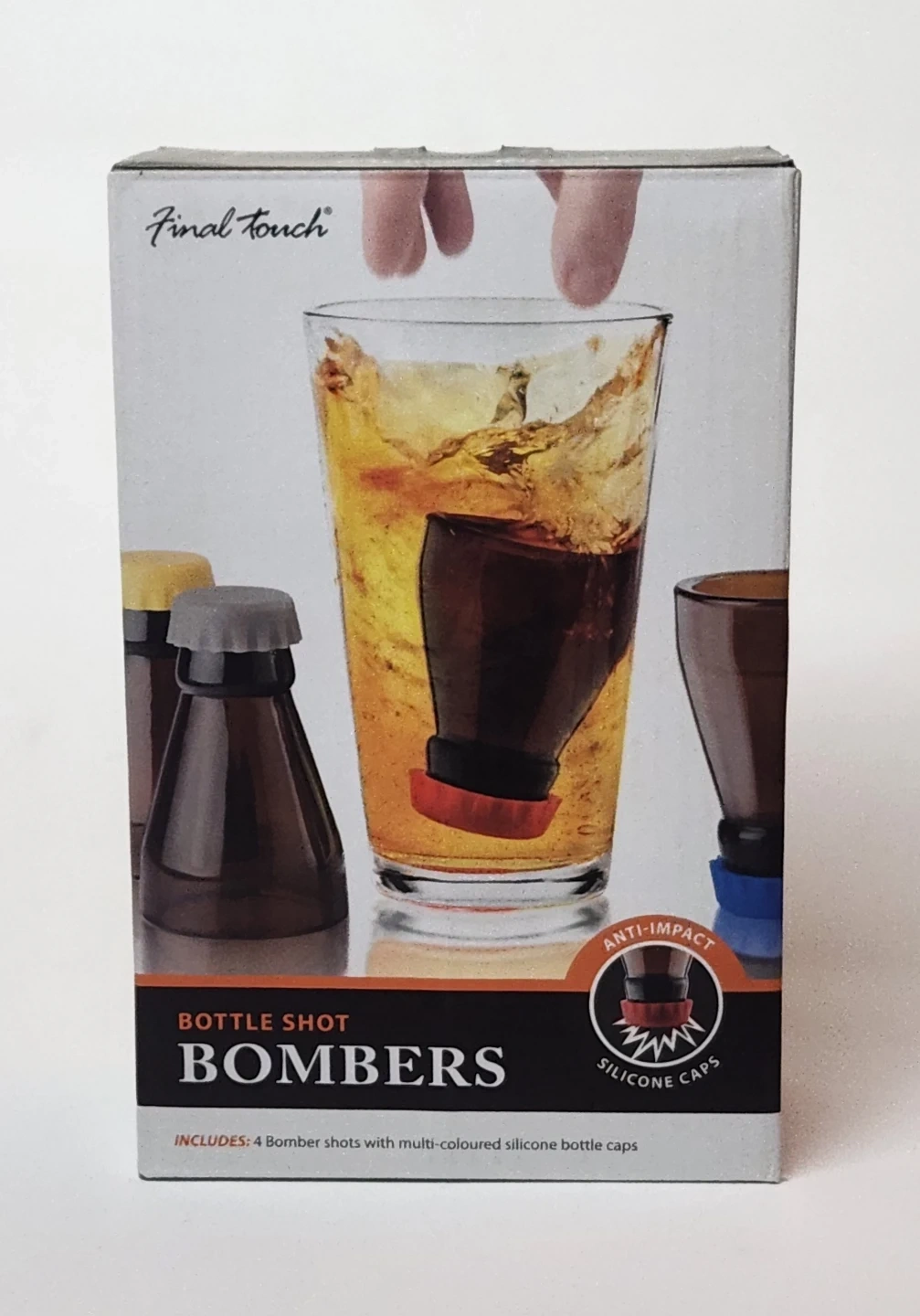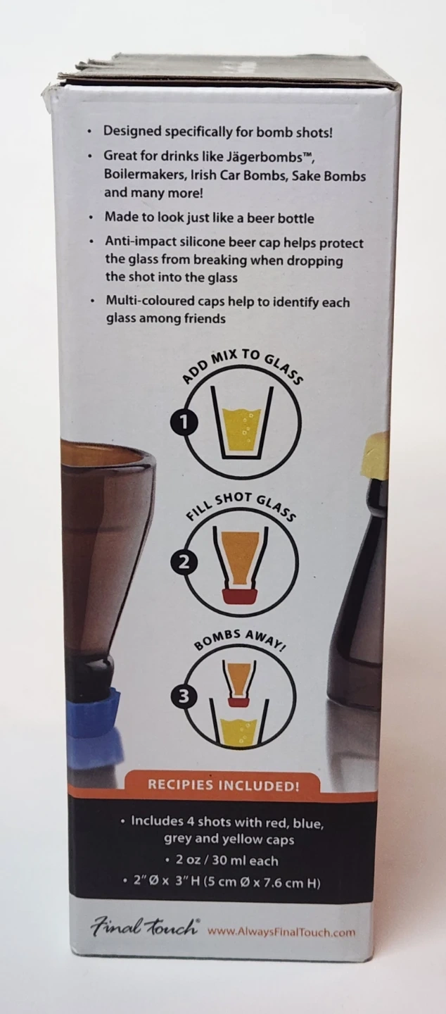Designed specifically for bomb shots these glasses feature a silicone cap that helps protect the glass from breaking when dropping the shot into the glass. Great for drinks like Jägerbombs™, Boilermakers, Irish Car Bombs, Sake Bombs and many more! Made to look just like a beer bottle with multi-coloured caps help to identify each glass among friends.