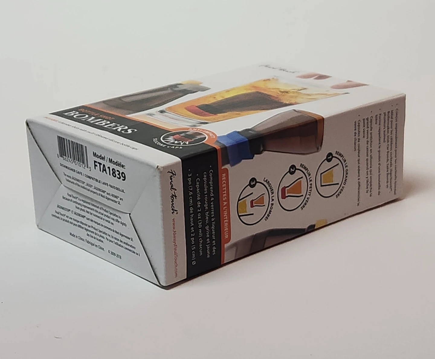 Designed specifically for bomb shots these glasses feature a silicone cap that helps protect the glass from breaking when dropping the shot into the glass. Great for drinks like Jägerbombs™, Boilermakers, Irish Car Bombs, Sake Bombs and many more! Made to look just like a beer bottle with multi-coloured caps help to identify each glass among friends.