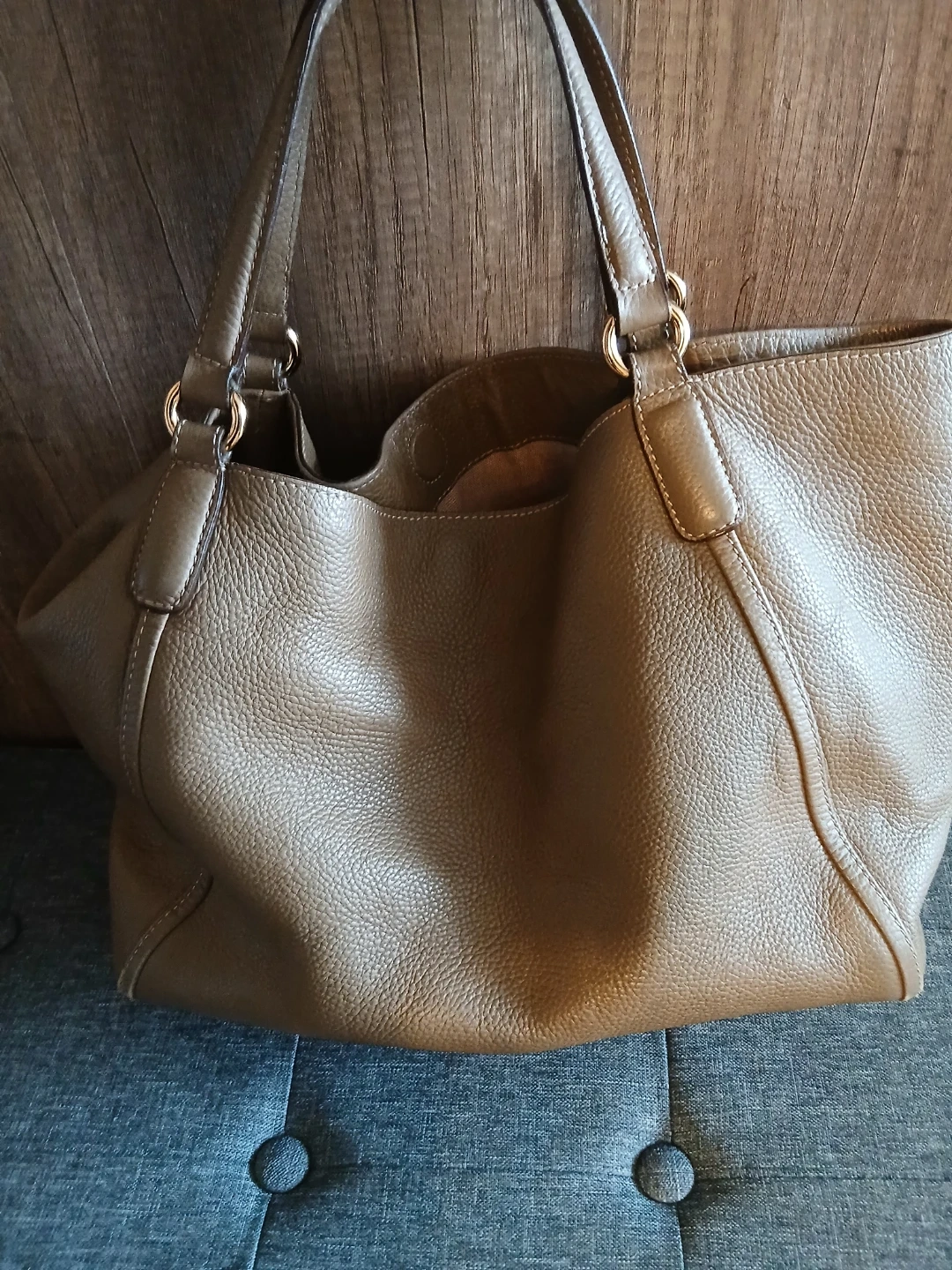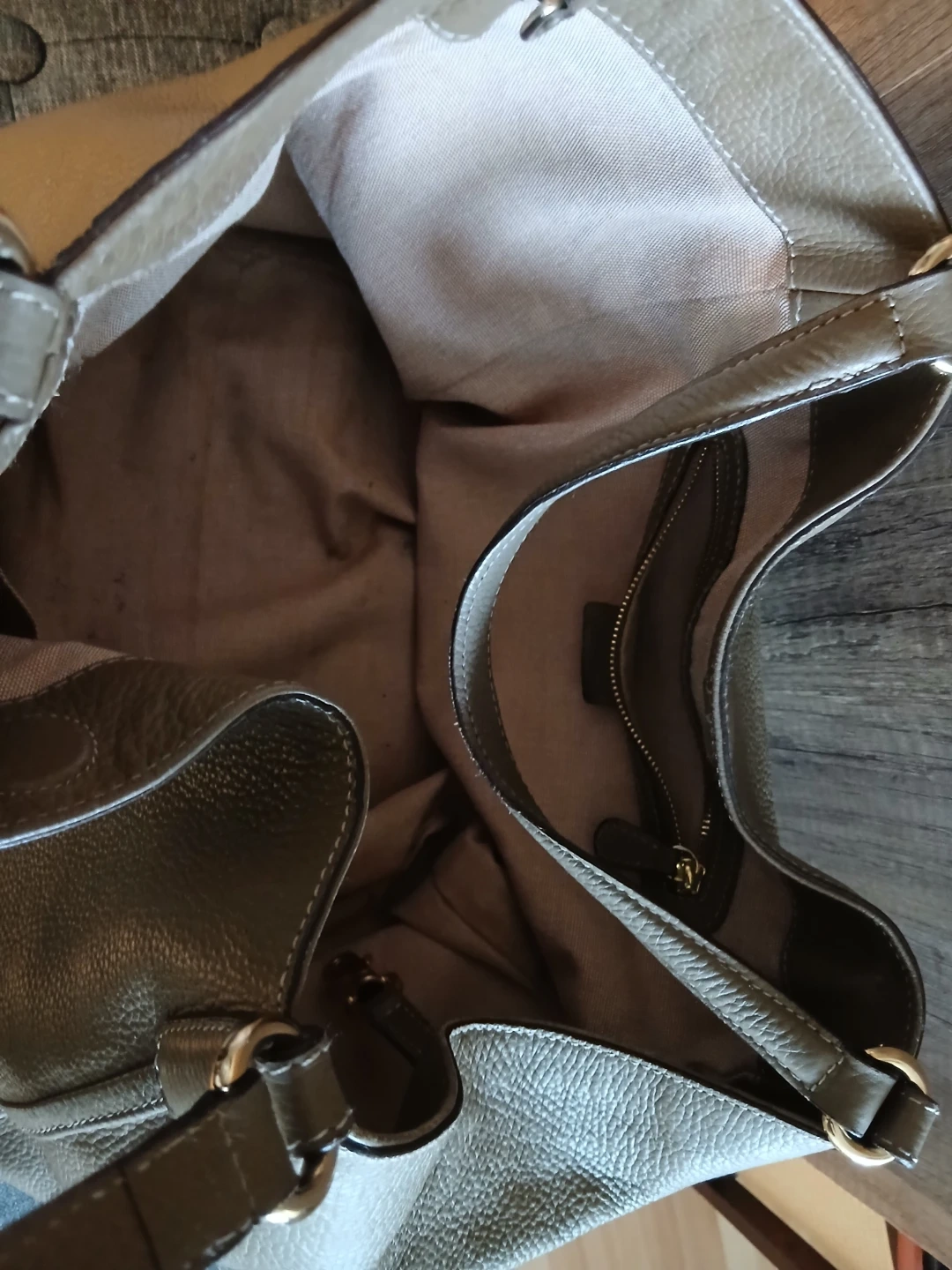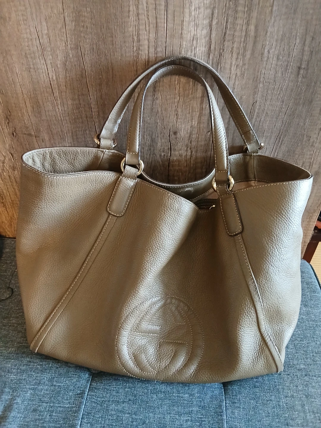 This is a Gucci leather tote bag. It's a soft, taupe-coloured leather with a classic embossed GG logo. The interior features a zippered pocket.