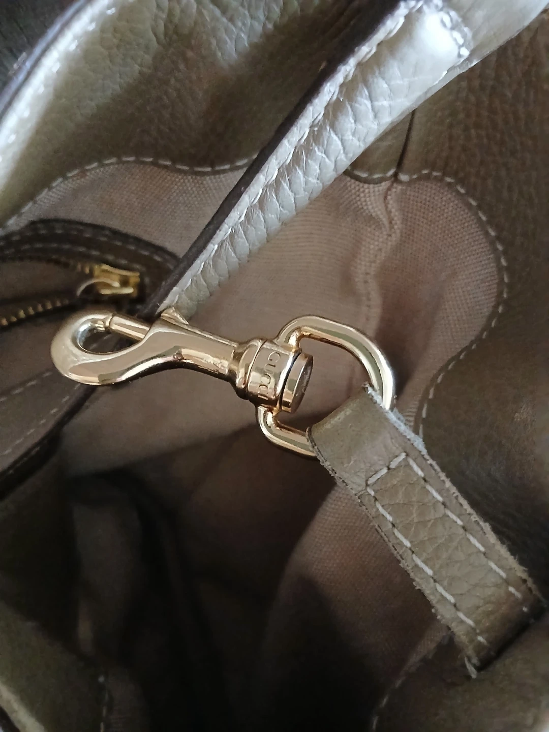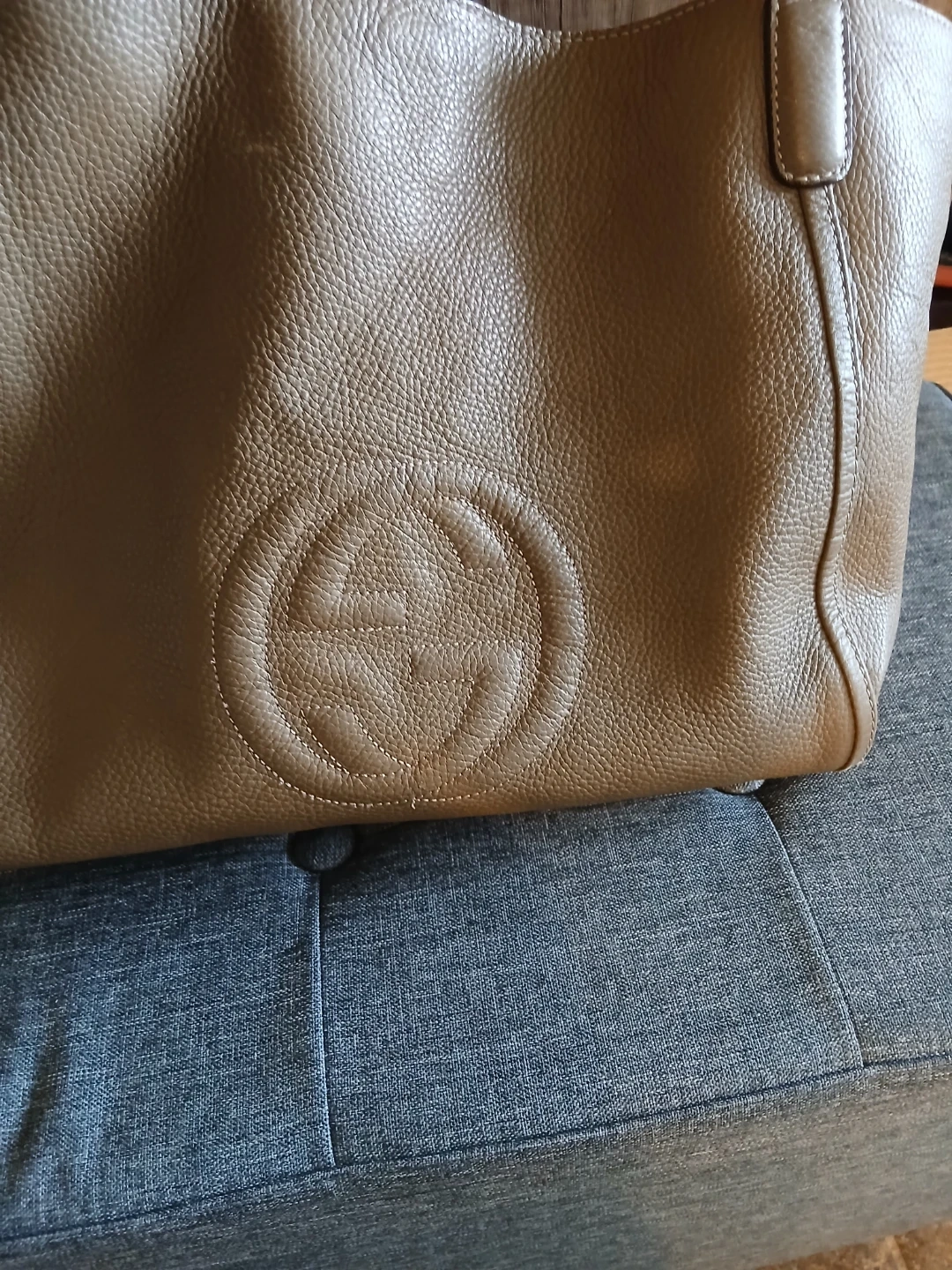 This is a Gucci leather tote bag. It's a soft, taupe-coloured leather with a classic embossed GG logo. The interior features a zippered pocket.