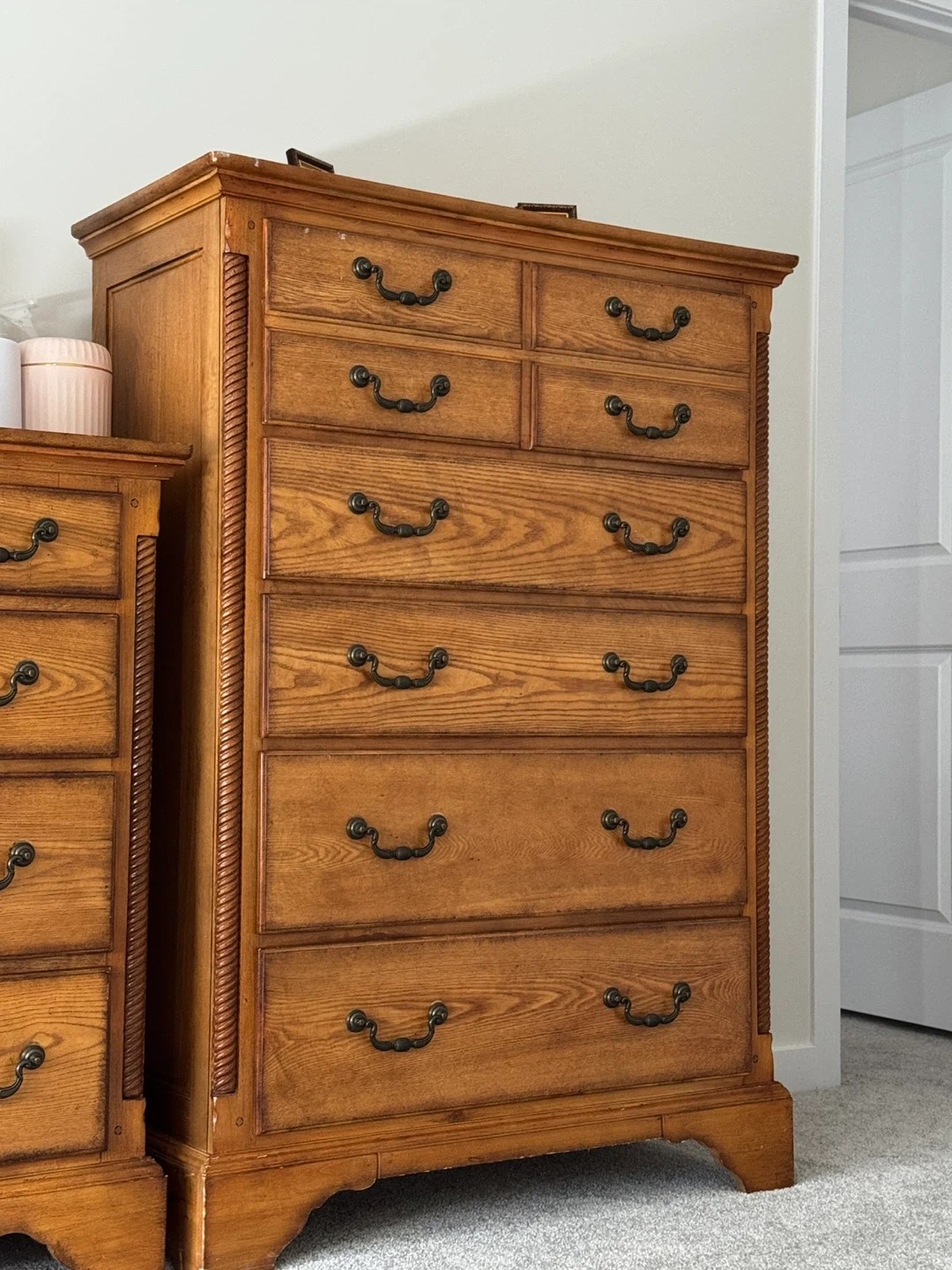 Wooden chest of drawers with a light oak finish. It has six drawers with ornate metal pulls. The piece features decorative fluting on the side panels.