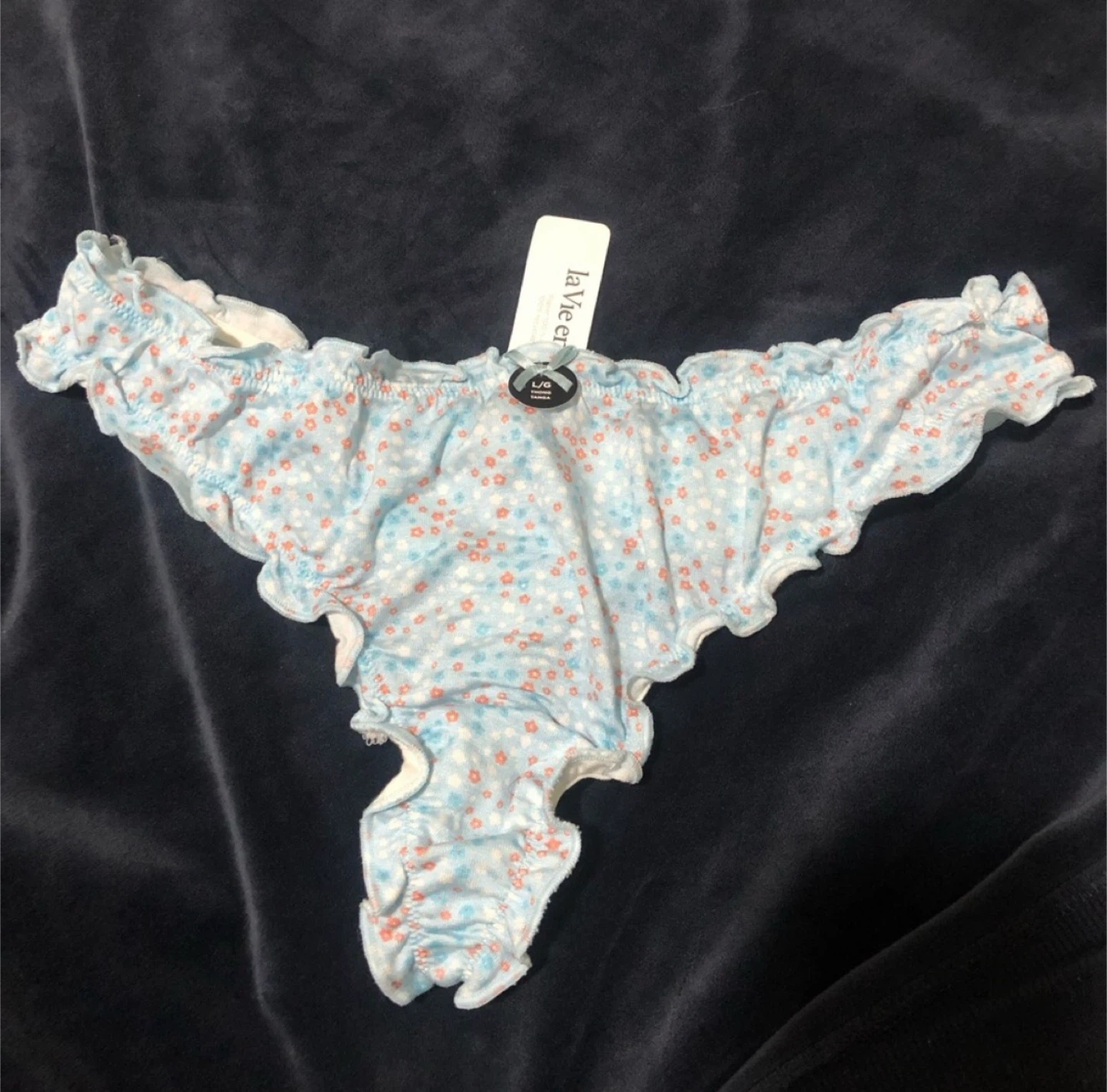 La Vie en Rose thong with a light blue base and a small floral print. It features a ruffled elastic waistband and leg openings. Size L/G.