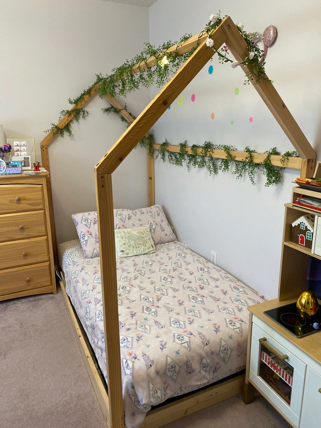 In great condition floor bed. Mattress sits on floor but if you’re handy you can install slats. Mattress/boxspring is not included Green vines also not included Not in the picture, but there is another piece at the top that goes along the side. It’s just in storage. We didn’t put that one in so we don’t bump our heads when making the bed. Pet and smoke free home Pick up and cash only Main intersection is Queen and Chinguacousy