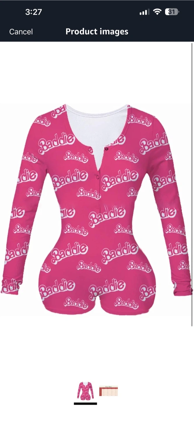 This pink onesie features a repeating 'Baddie' pattern. It's a comfortable and fun piece for lounging. Material is a soft comfortable fabric blend, perfect for relaxing at home. Size Small