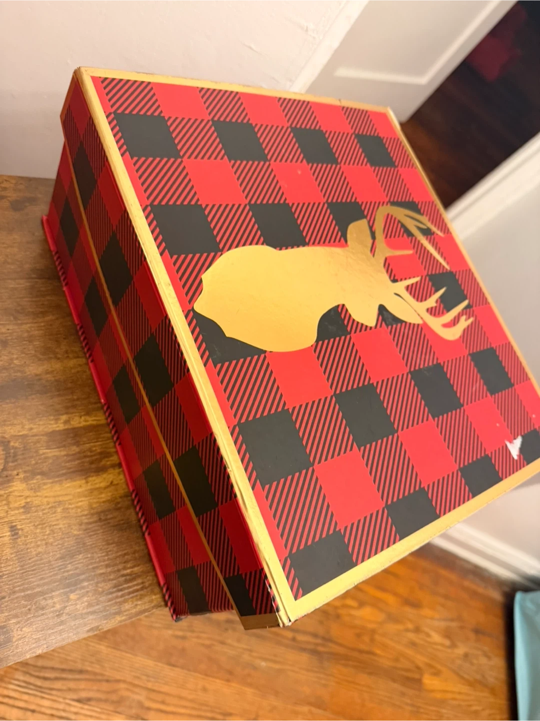 This festive gift box features a red and black buffalo plaid pattern with a metallic gold deer silhouette. It's perfect for holiday gifting or seasonal storage. Cardboard construction.