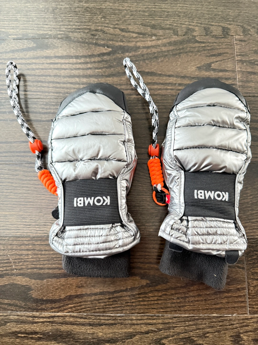 Selling a pair of Kombi mittens. They are silver with black wrist cuffs and orange detailing on the drawstrings. Great for keeping your hands warm during the winter months!