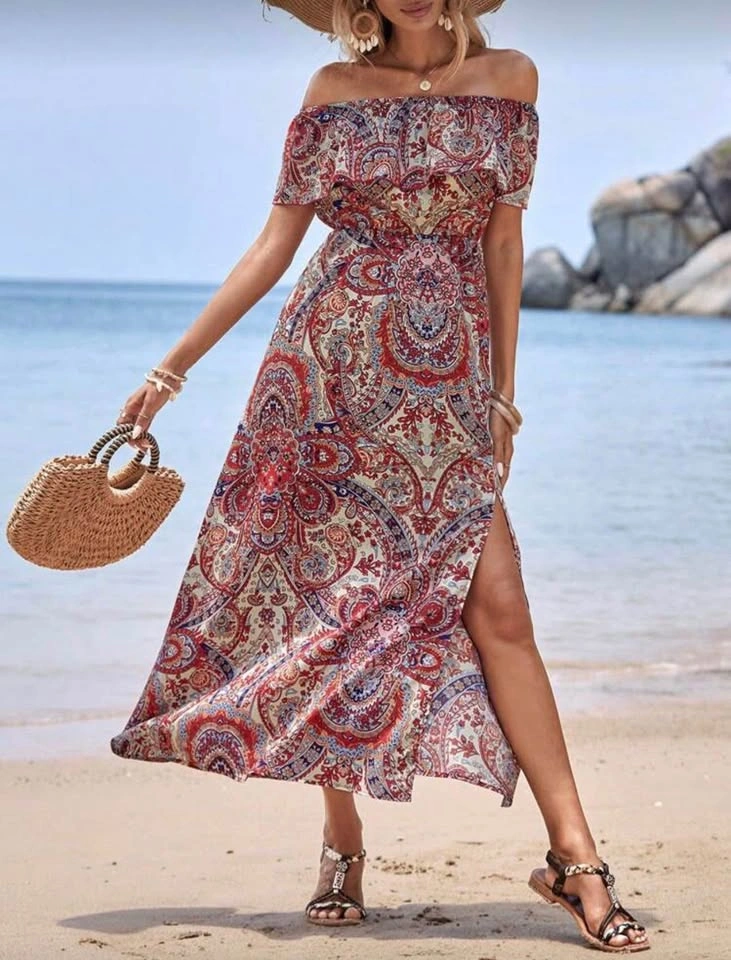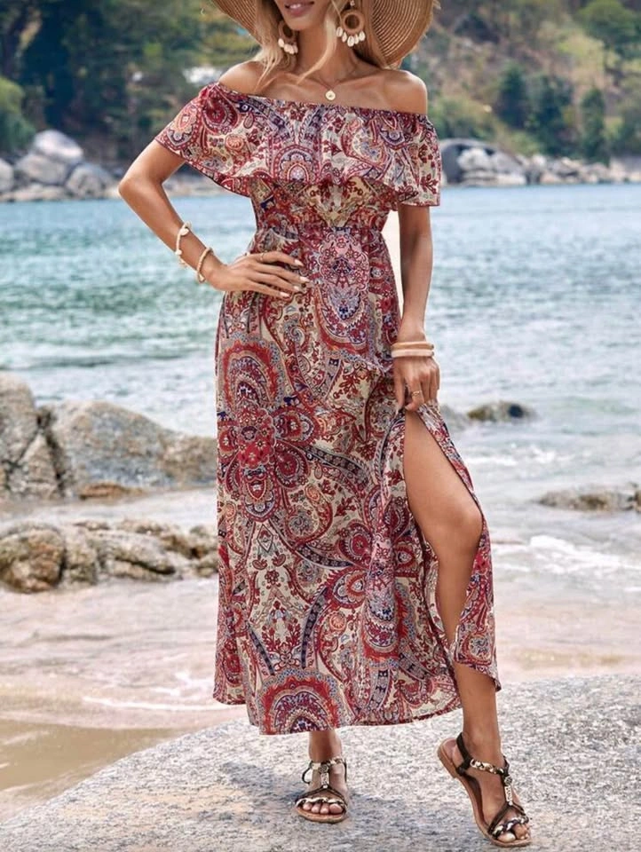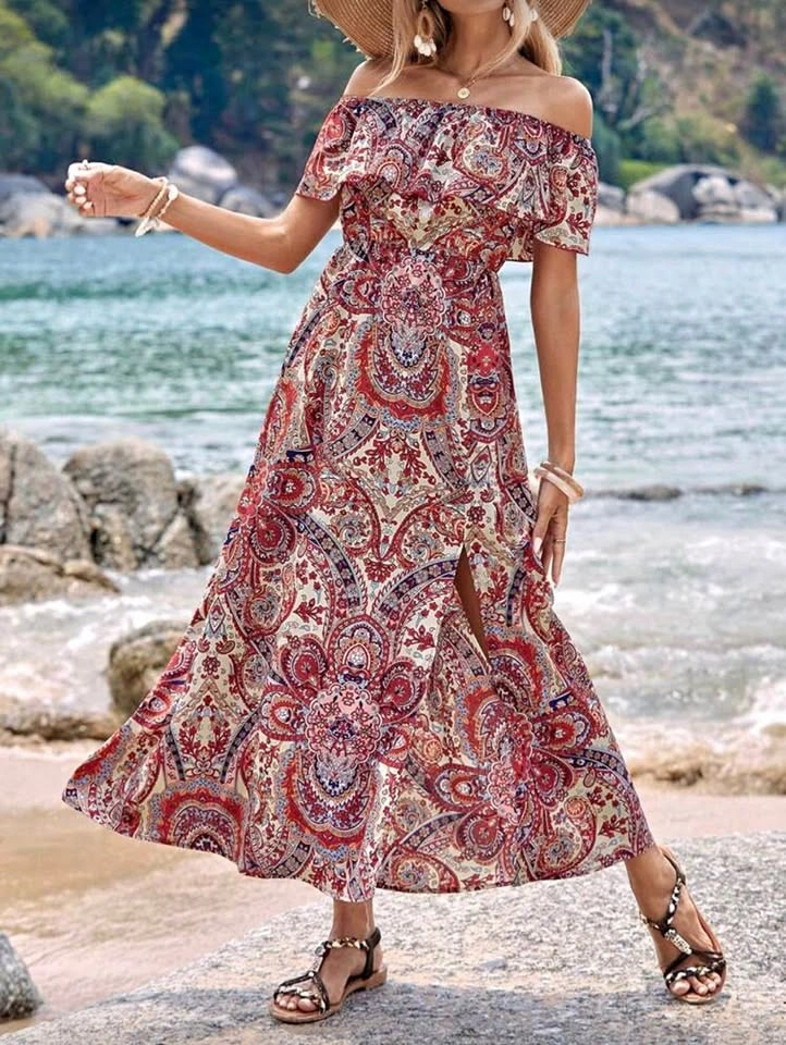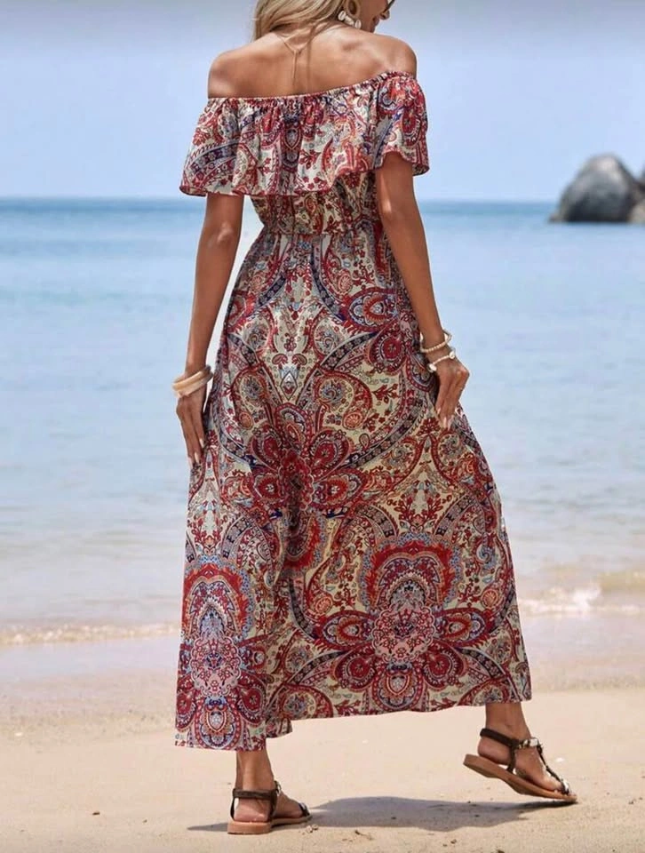 VCAY Paisley Print Off Shoulder Ruffle Trim Dress