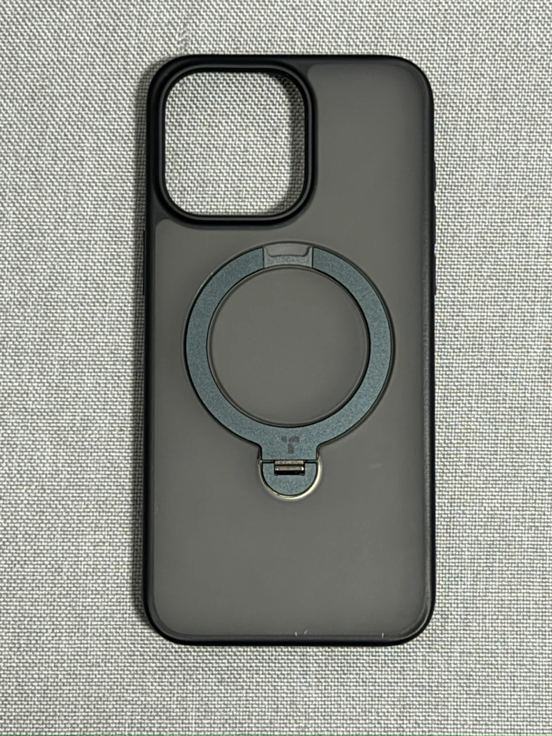 Torras black iPhone 15 Pro Max case offers protection and convenience. It features a built-in ring stand for hands-free viewing.
