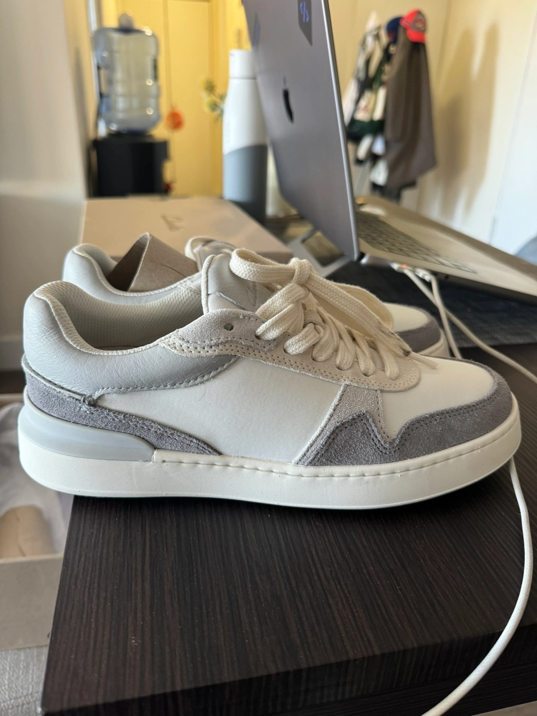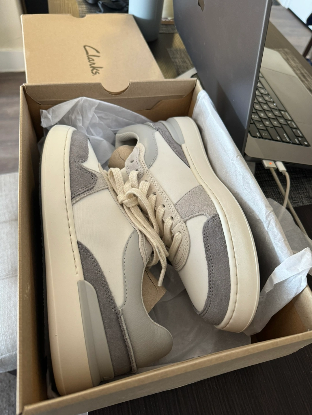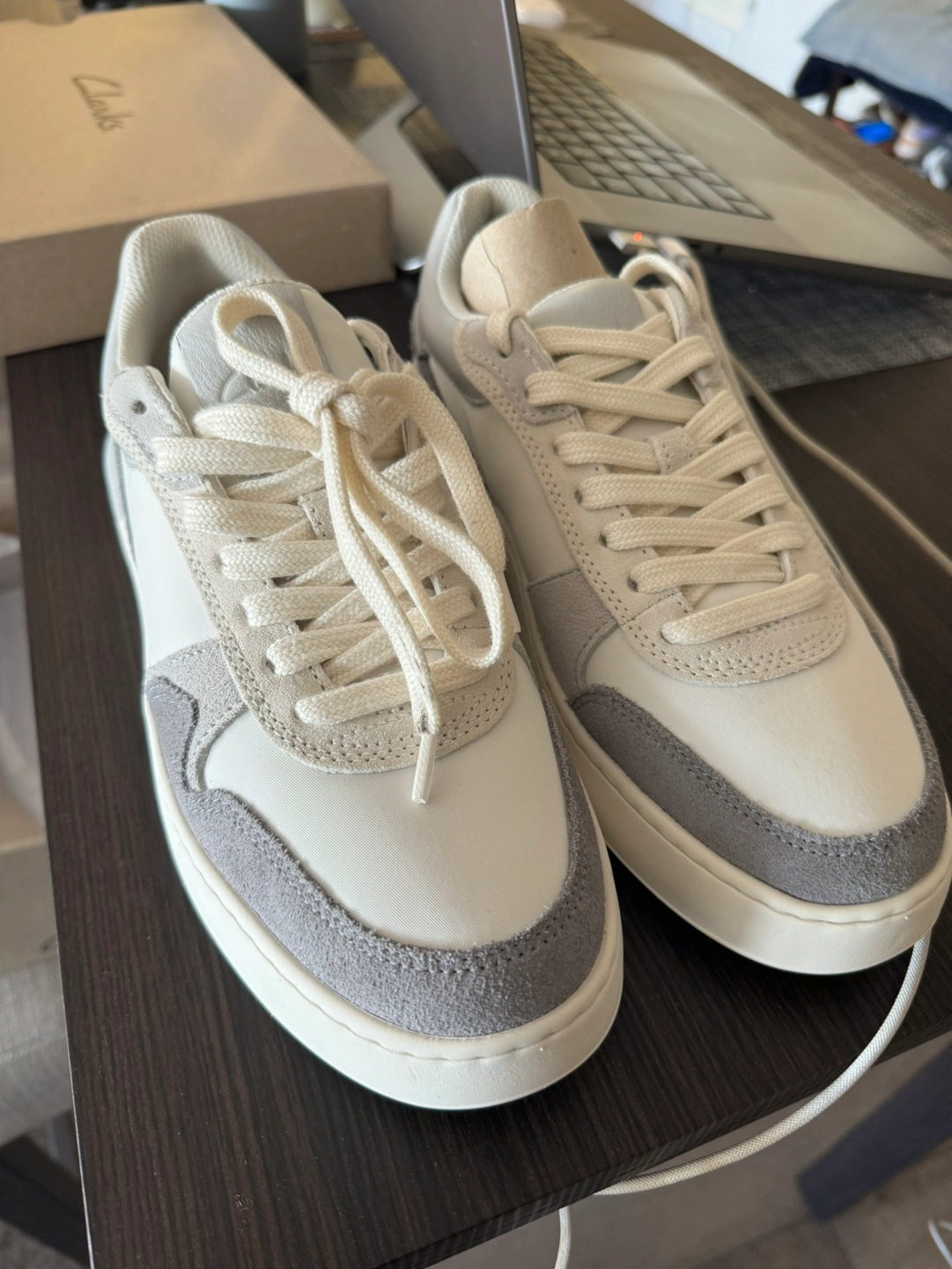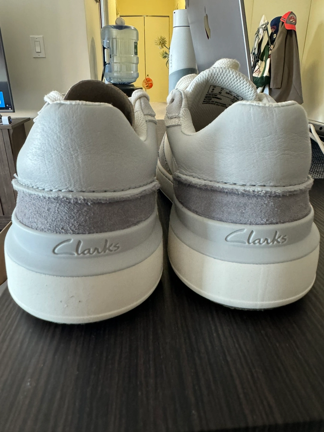 These are white leather sneakers with grey accents. They are in a casual style and have a lace-up closure. They are made by Clarks. Ordered them 3 months ago but never used them as I prefer my used distressed white adida sneakers.