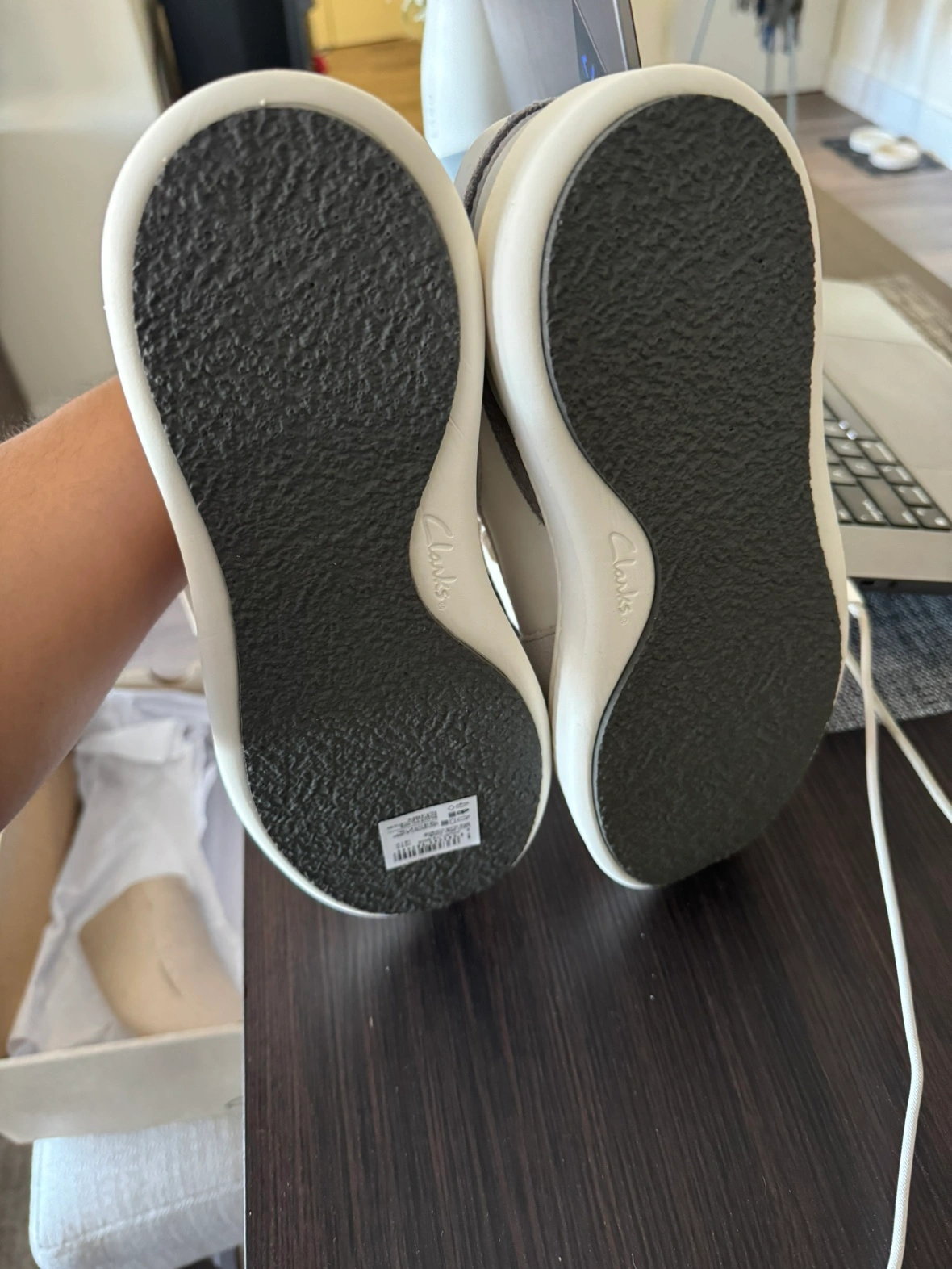 These are white leather sneakers with grey accents. They are in a casual style and have a lace-up closure. They are made by Clarks. Ordered them 3 months ago but never used them as I prefer my used distressed white adida sneakers.