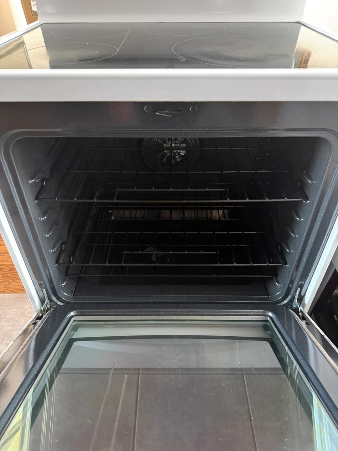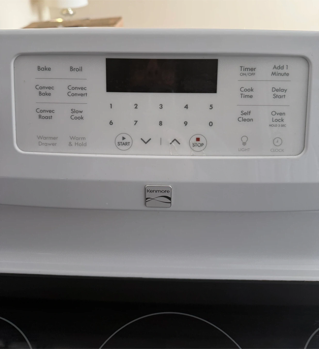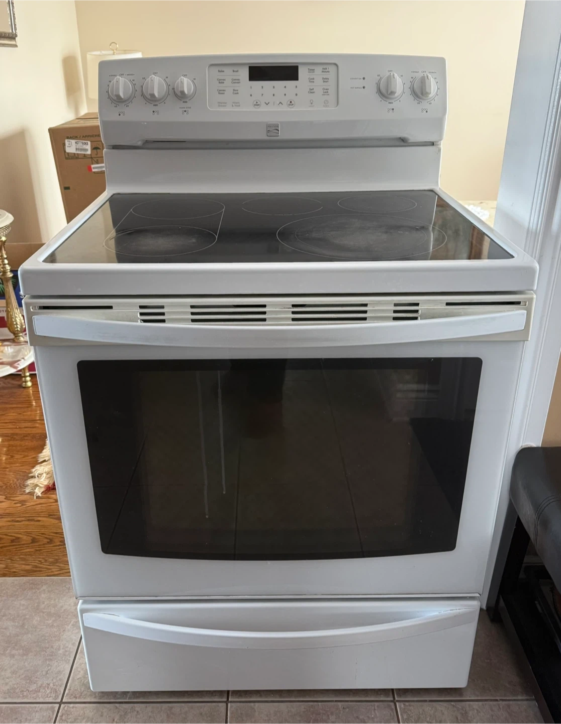 White Kenmore electric stove with a smooth cooktop. It features a convection oven with multiple cooking modes and a warming drawer. Digital display and controls are easy to use.
