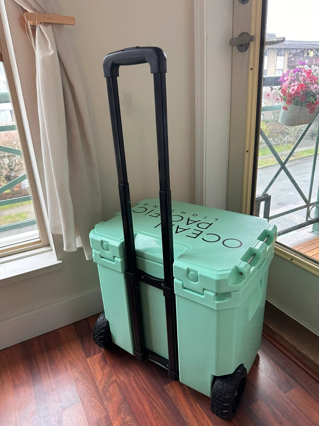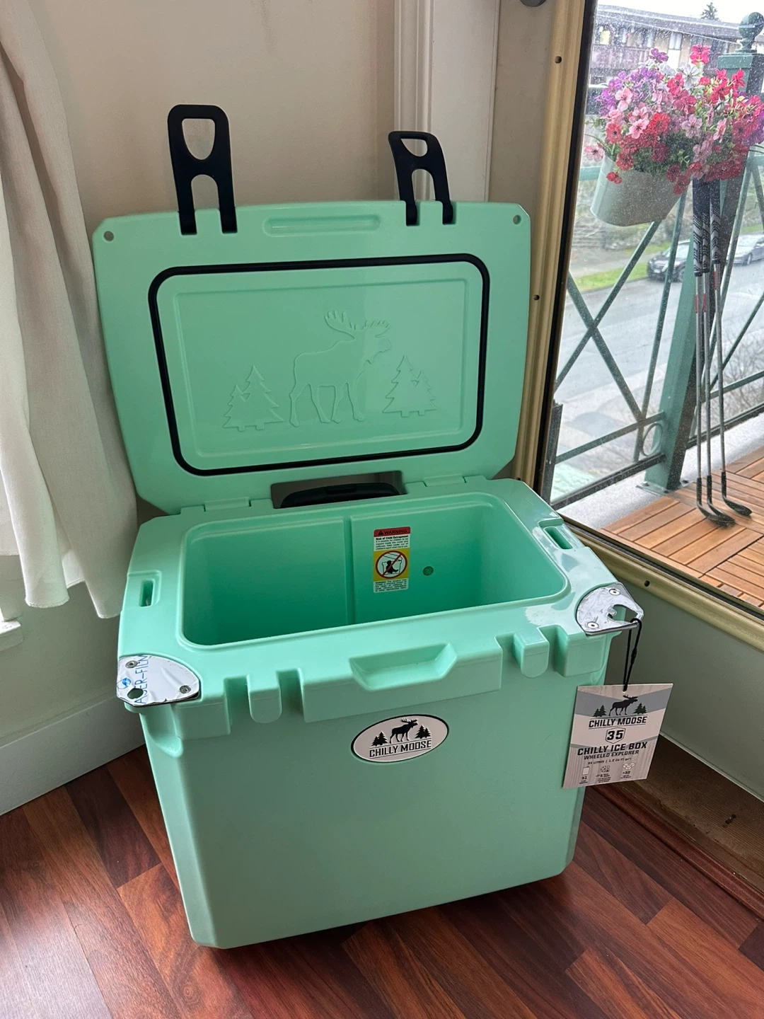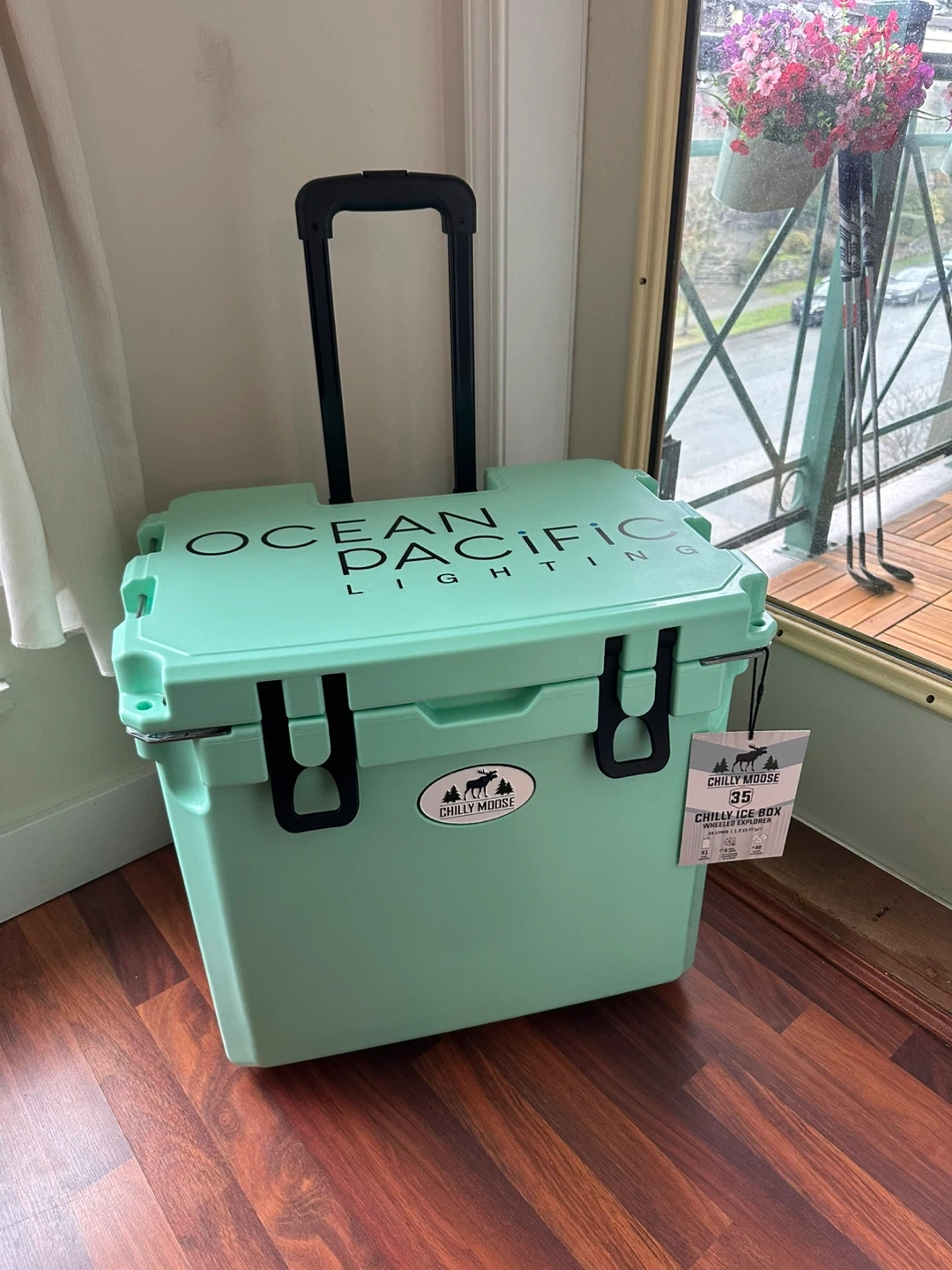 Chilly Moose 35L Wheeled Explorer ice box in a light mint green colour. It holds 35 litres or 1.2 cu ft, with ice retention for up to 5 days. It's perfect for camping trips or tailgating!