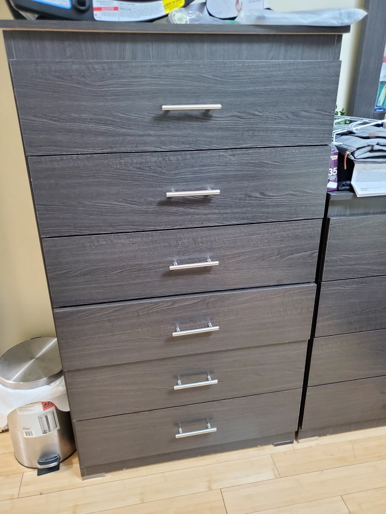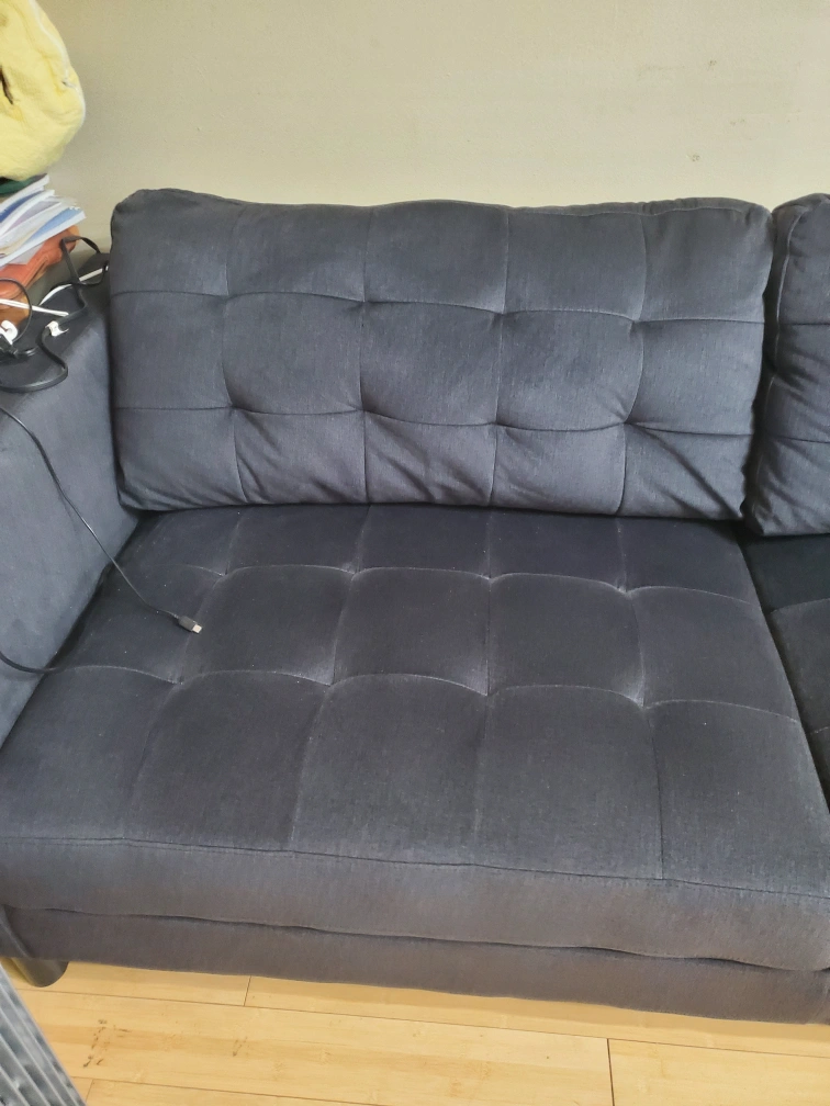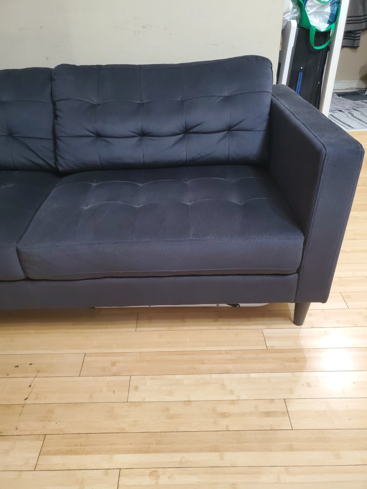 Comfortable dark grey fabric sofa. Button-tufted design. Matching bedroom set includes a dresser with mirror and a tall chest of drawers. Dark grey wood finish. Silver drawer pulls. Excellent for a modern bedroom. And 2 night stands.