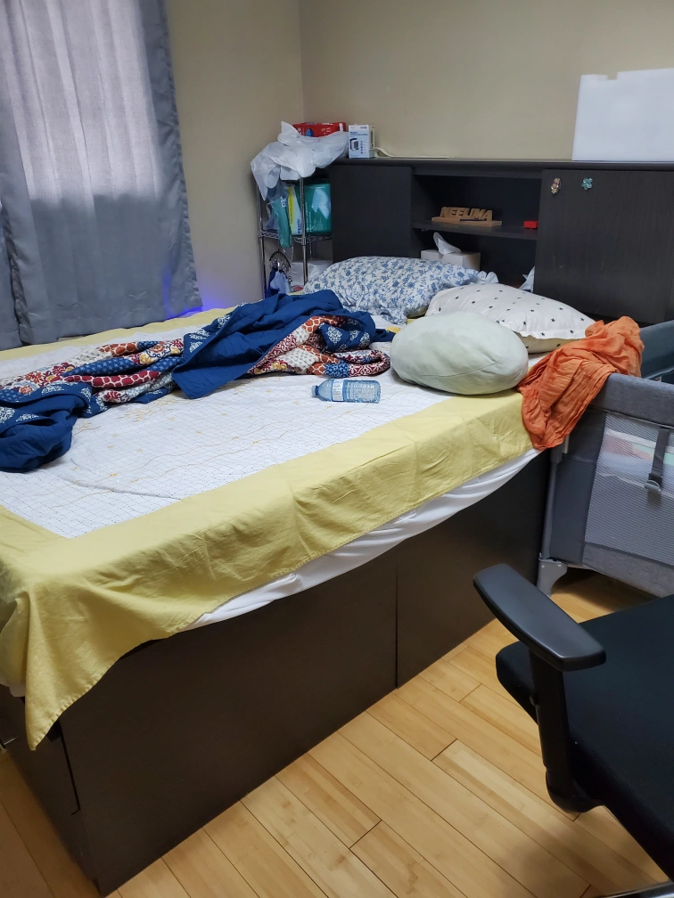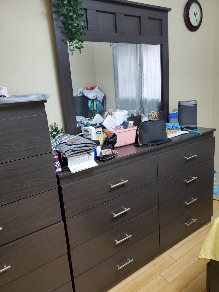 Comfortable dark grey fabric sofa. Button-tufted design. Matching bedroom set includes a dresser with mirror and a tall chest of drawers. Dark grey wood finish. Silver drawer pulls. Excellent for a modern bedroom. And 2 night stands.