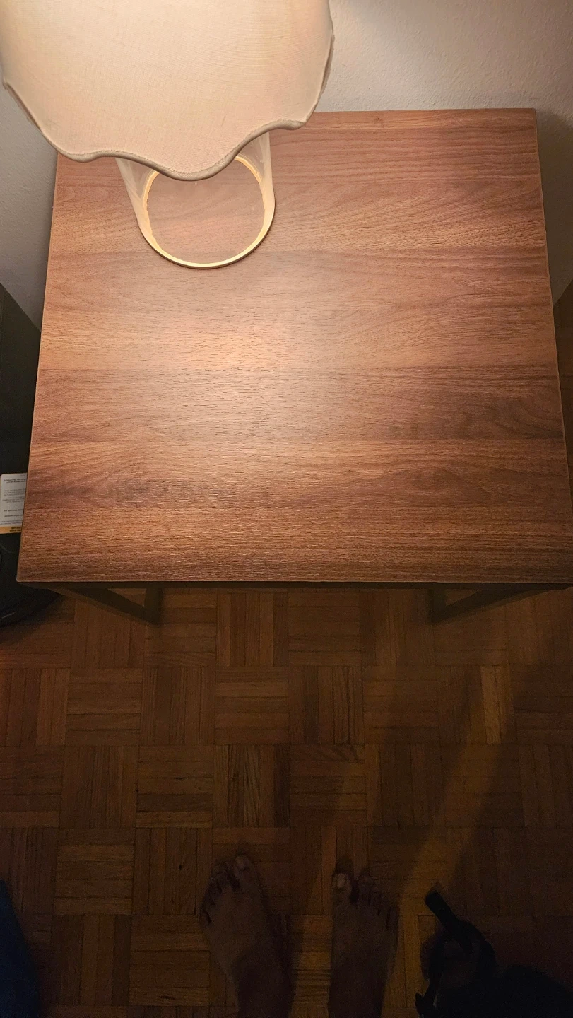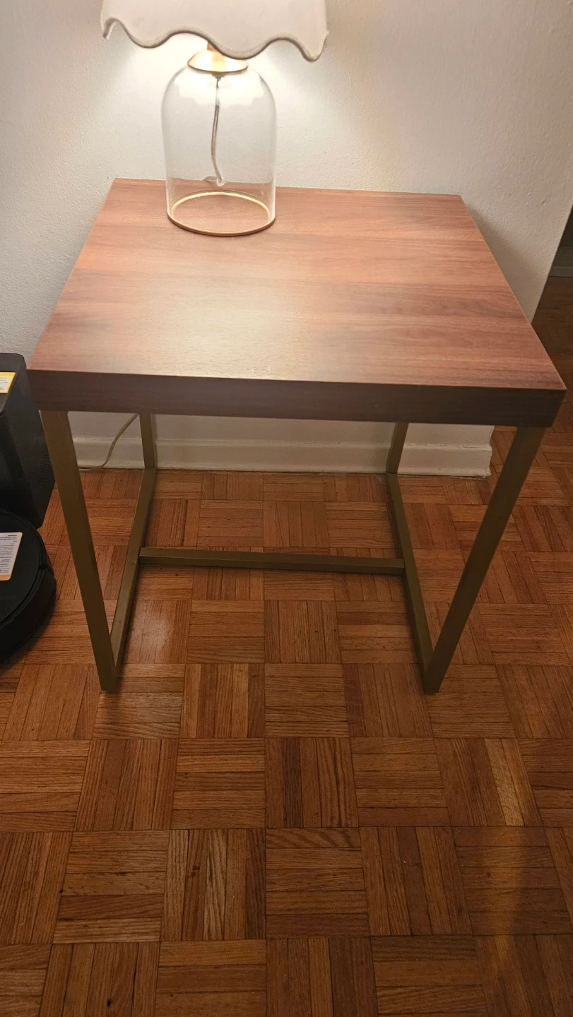 Stylish side table with a sleek gold metal frame. It's a great size for beside a couch or an armchair. The design fits well in modern or minimalist spaces! However is a little wobbly can be fixed to the wall but great look.