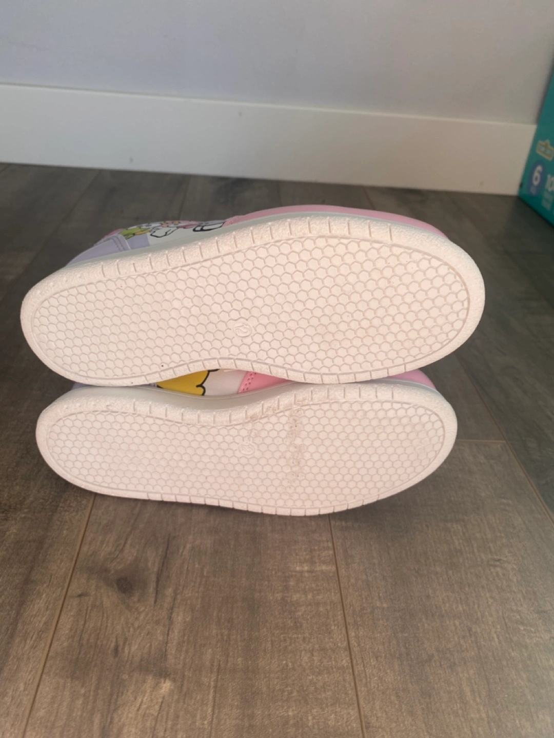 These cute sneakers feature Hello Kitty and her friends! They have a white, pink, and purple colour scheme with playful character graphics on the sides. Perfect for little ones who love Sanrio characters. Lace-up closure for a secure fit.