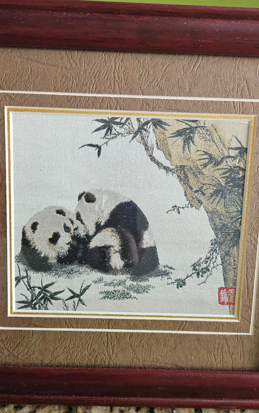 This framed tapestry features a charming scene of two pandas nestled amongst bamboo. The art is mounted in a wooden frame with a textured matting. It's a lovely decorative piece.