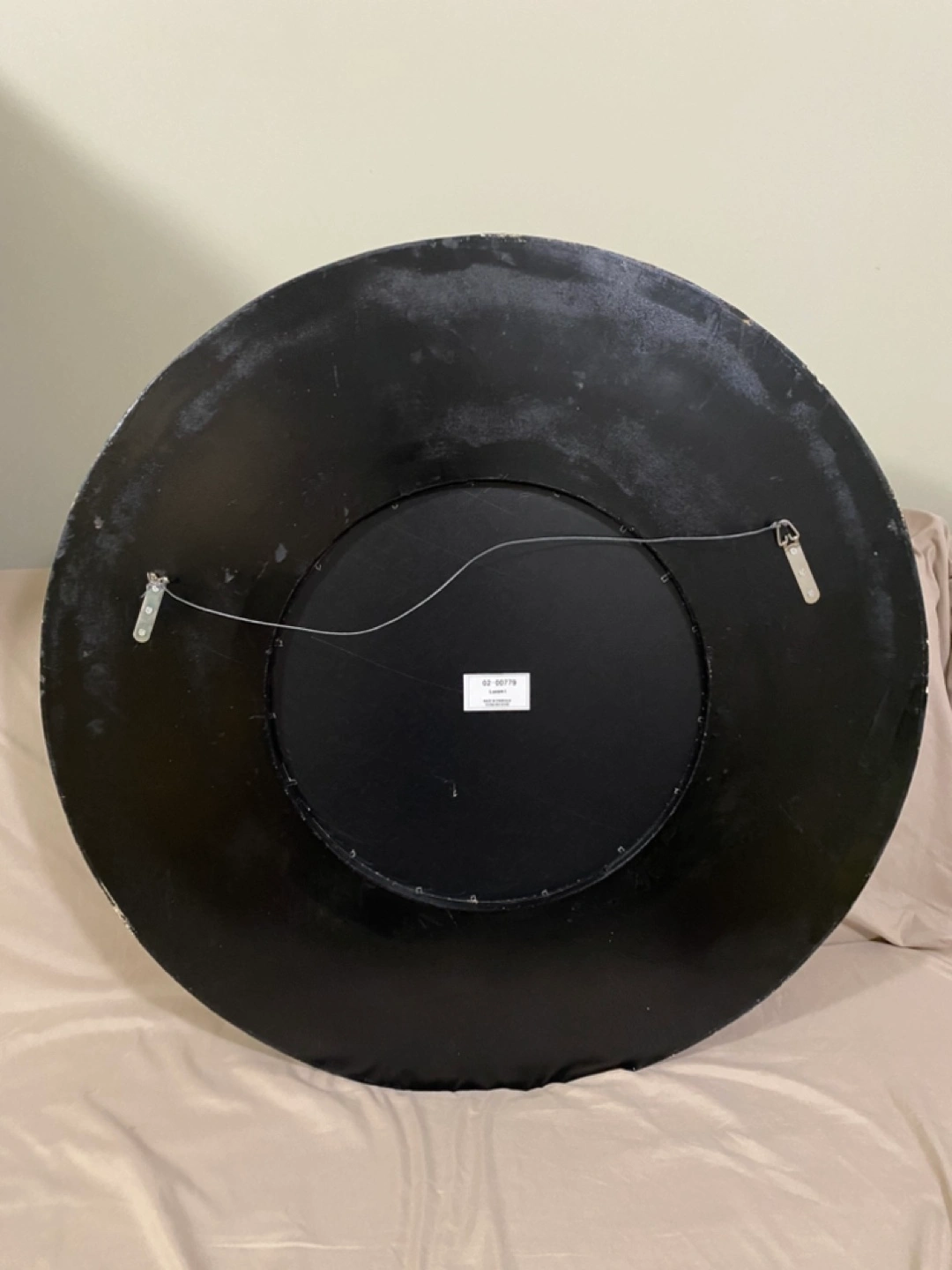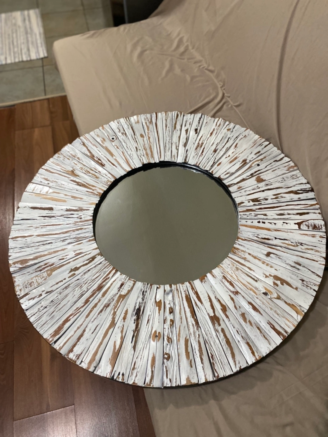 Beautiful circular mirror. Features a large, round frame made of whitewashed wood. Distressed look. Perfect for adding a rustic or farmhouse touch to any room. Great condition.