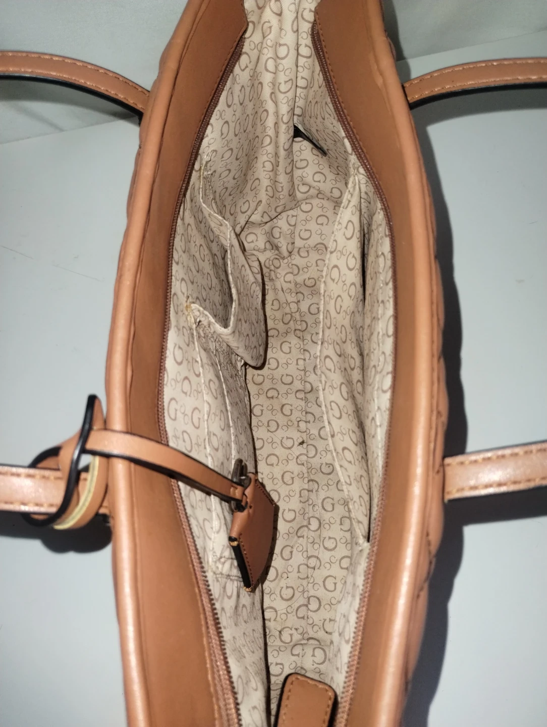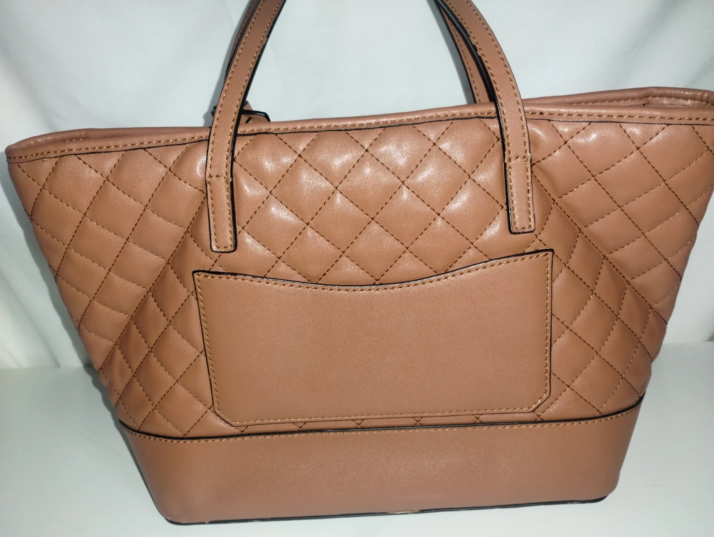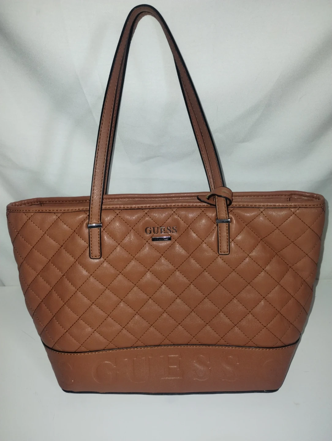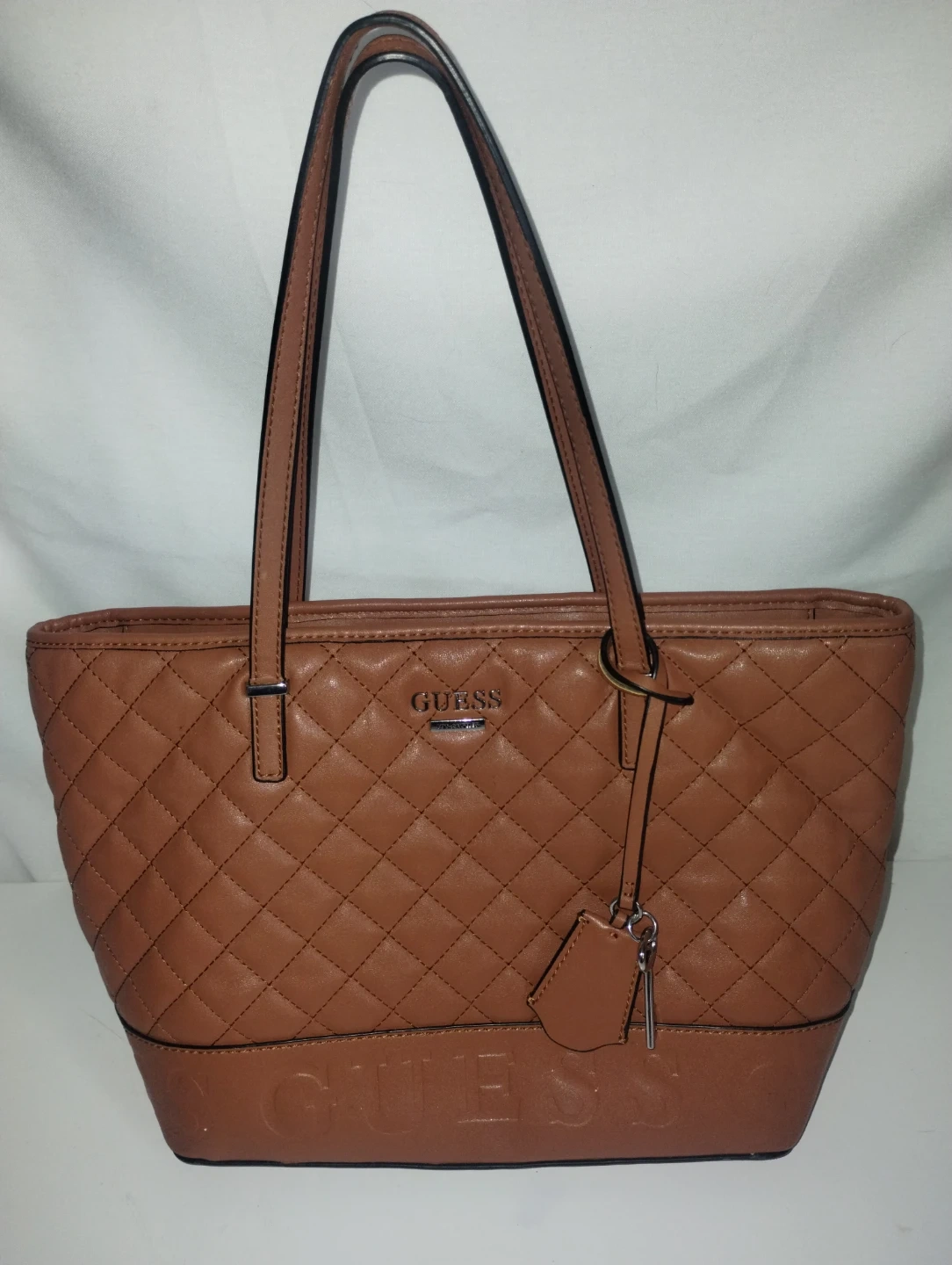 This is a Guess quilted tote bag. It's a rich brown color with a classic diamond quilting pattern. The interior features multiple pockets for organization. A stylish everyday bag!