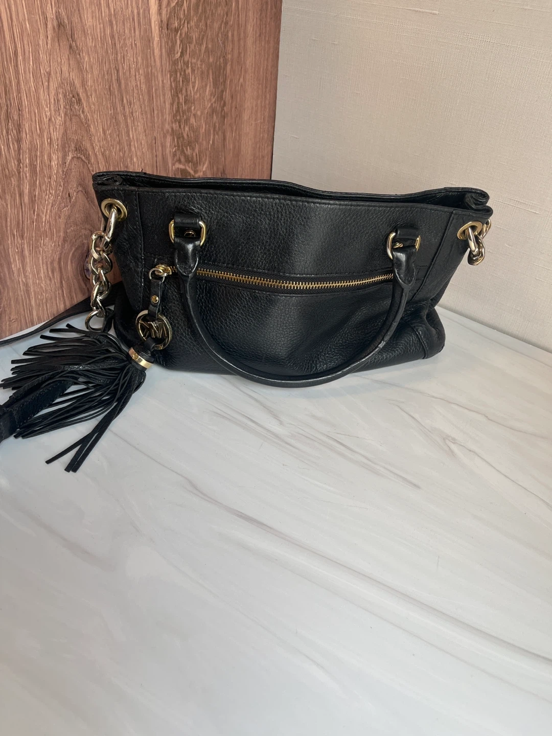This is a vintage black leather satchel handbag by Michael Kors. It features gold-tone hardware and a decorative tassel charm. The bag has a zip-top closure and an interior zip pocket. It also includes a beautiful detachable crossbody strap. Unfortunately selling due to lack of space.