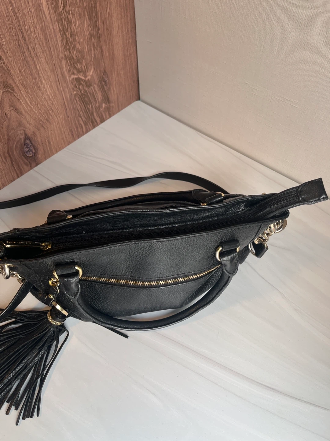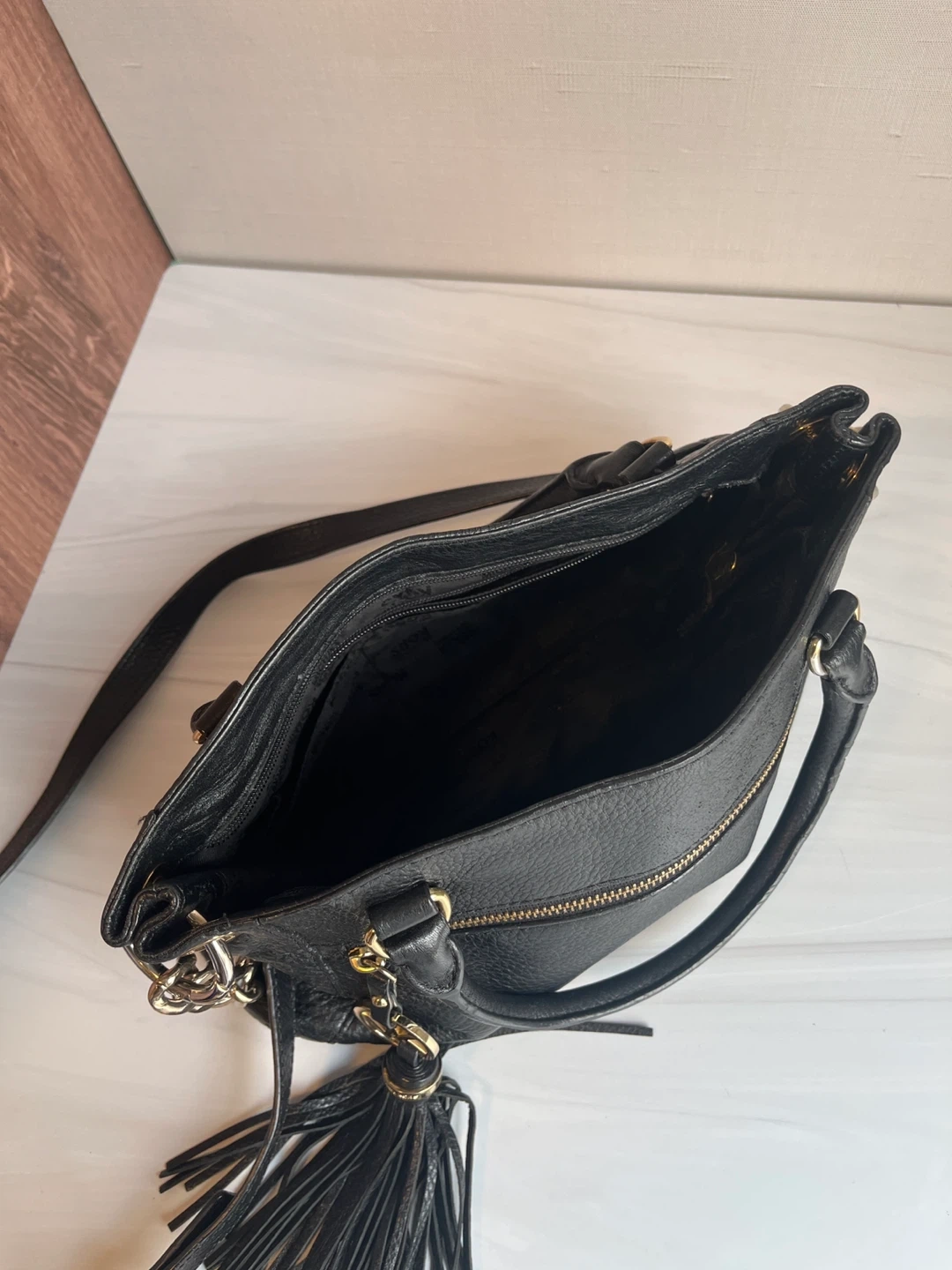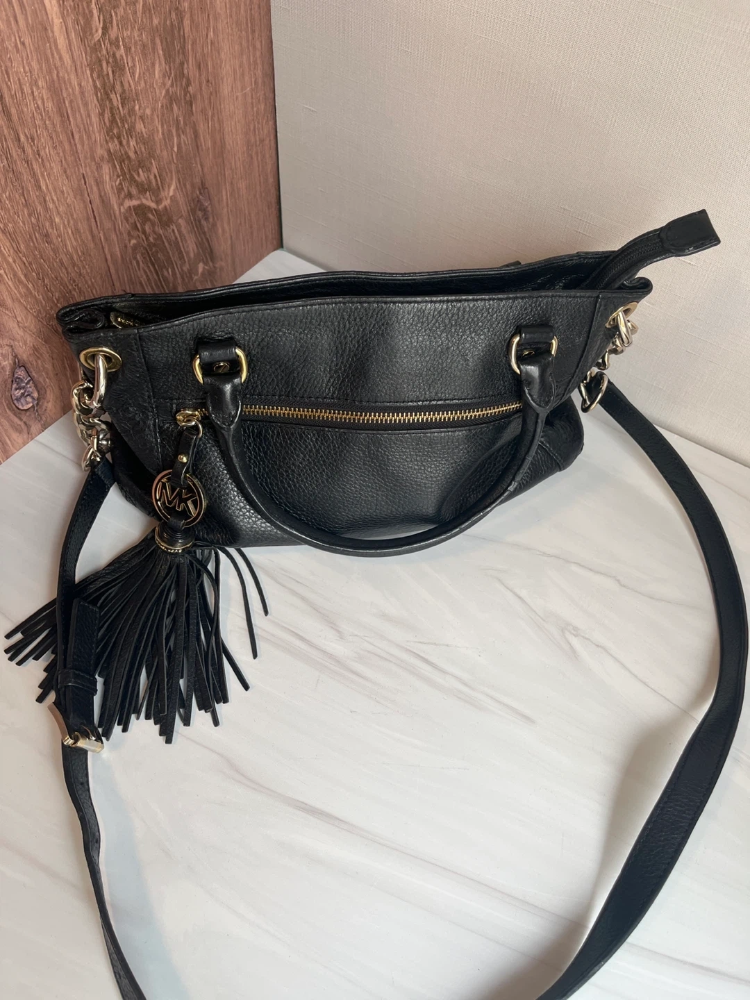 This is a vintage black leather satchel handbag by Michael Kors. It features gold-tone hardware and a decorative tassel charm. The bag has a zip-top closure and an interior zip pocket. It also includes a beautiful detachable crossbody strap. Unfortunately selling due to lack of space.
