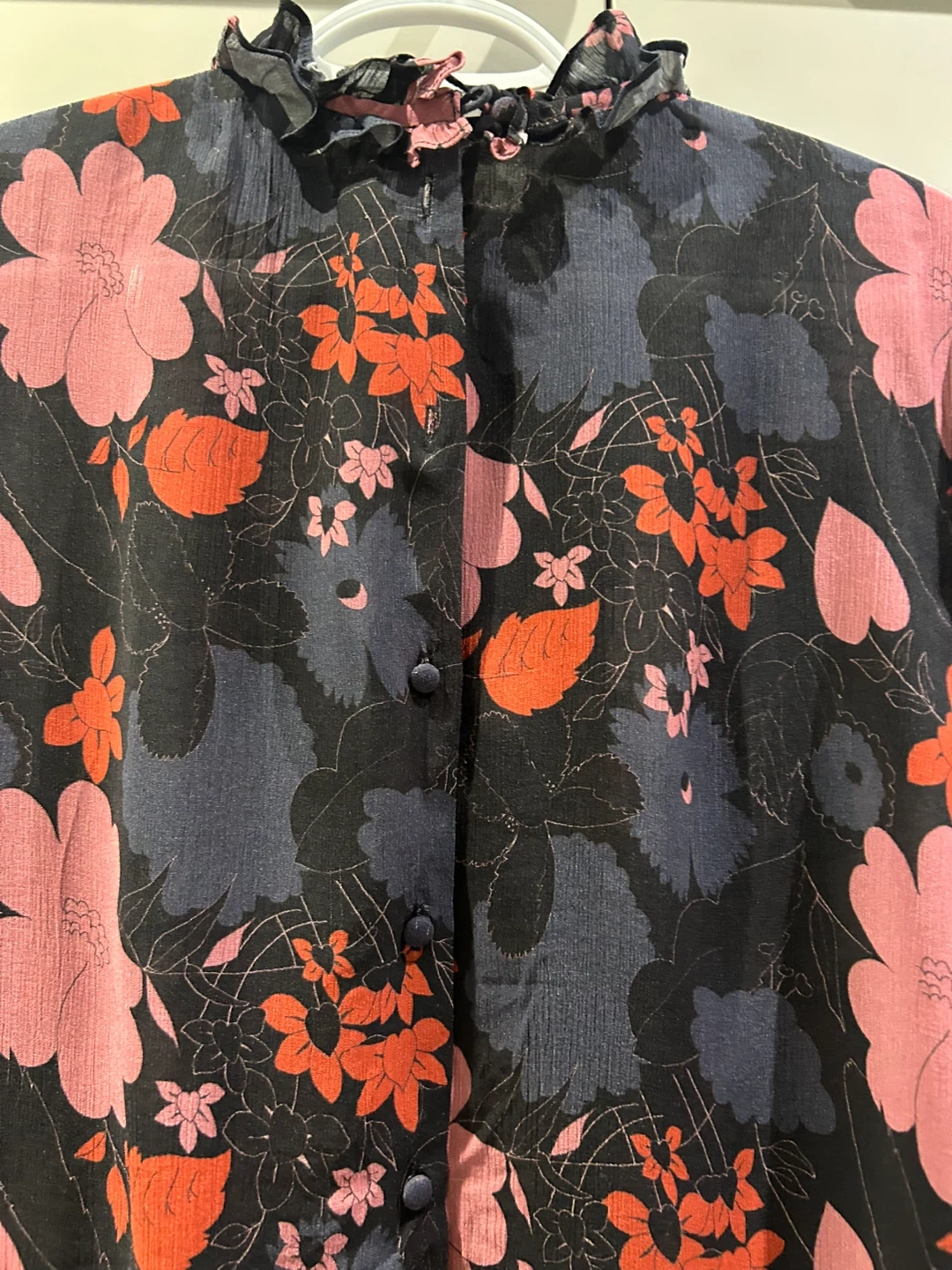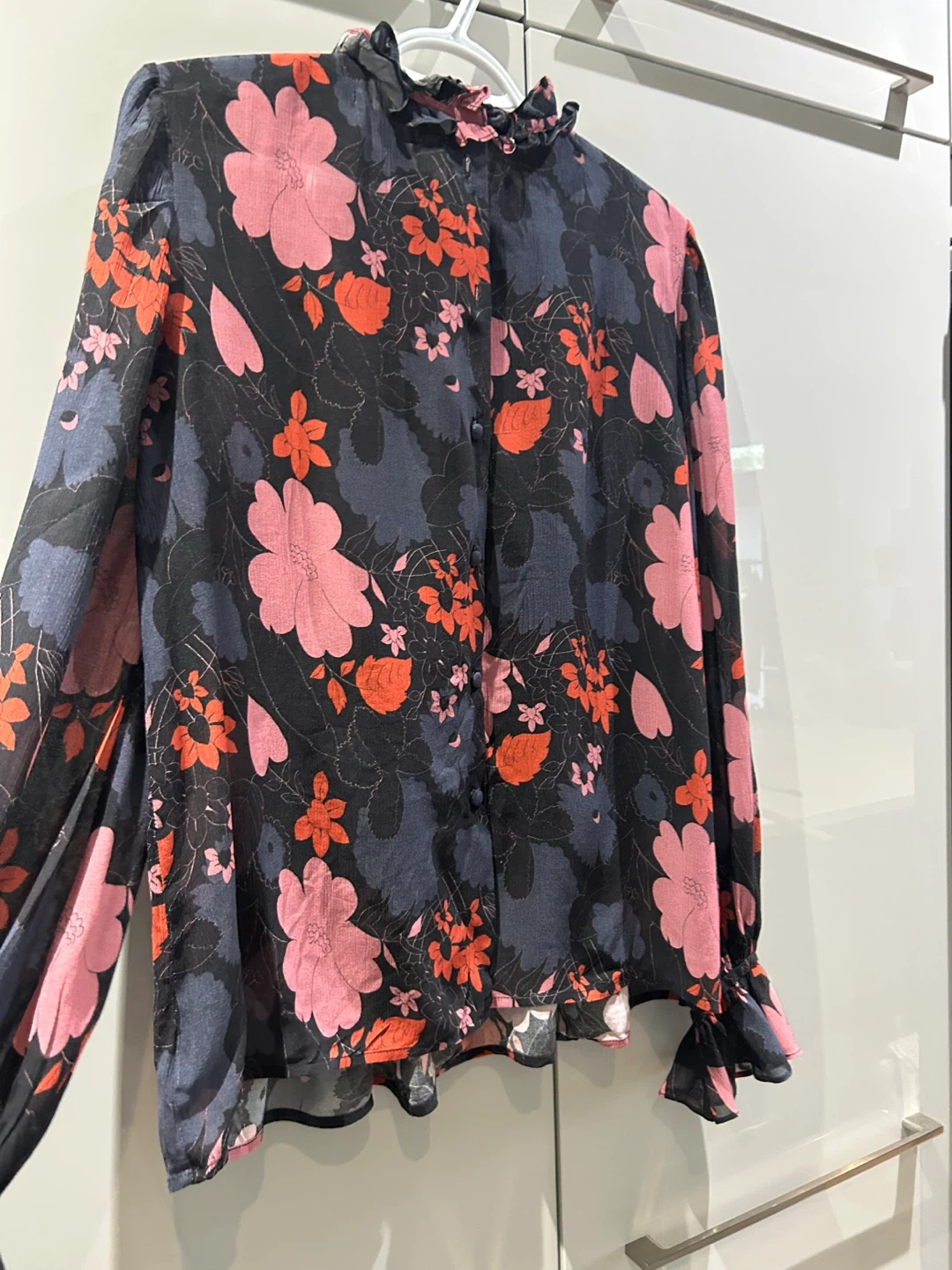 Gorgeous Jillian floral blouse with a smocked neck and ruffled details. It's made with a lightweight fabric and features long sleeves with ruffled cuffs. Perfect for adding a touch of flair to any outfit!