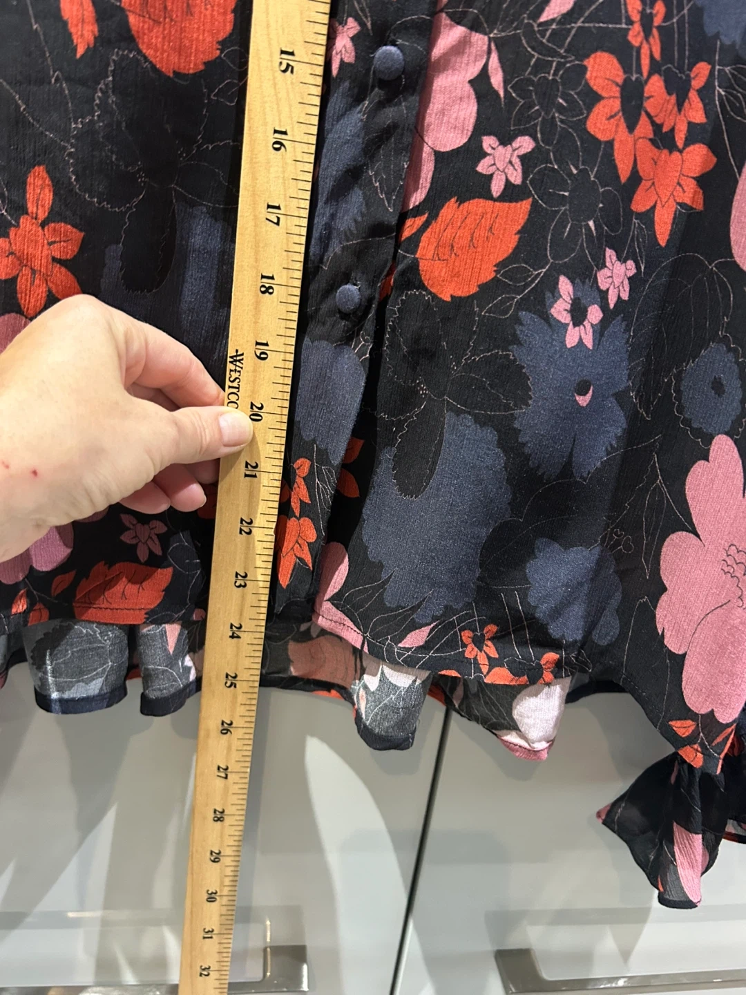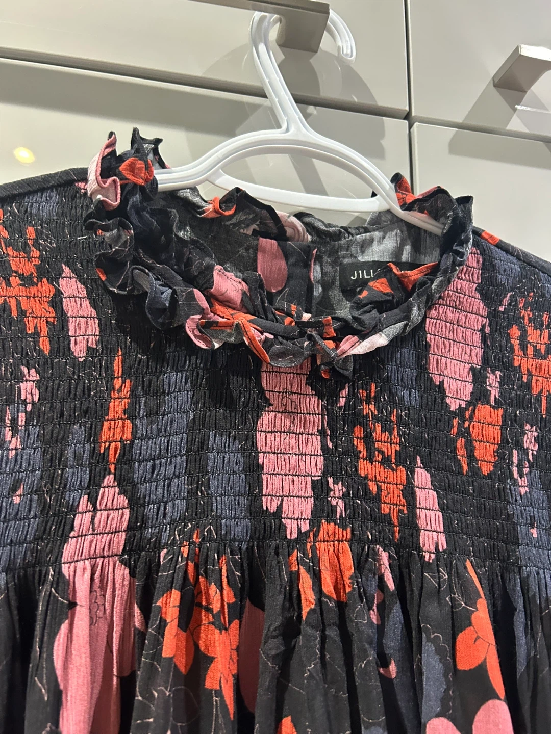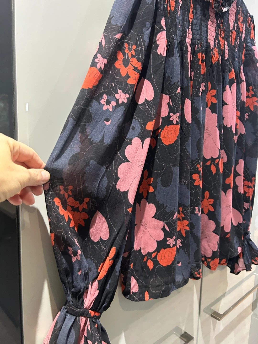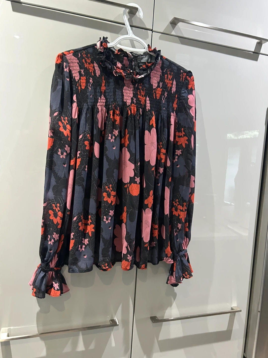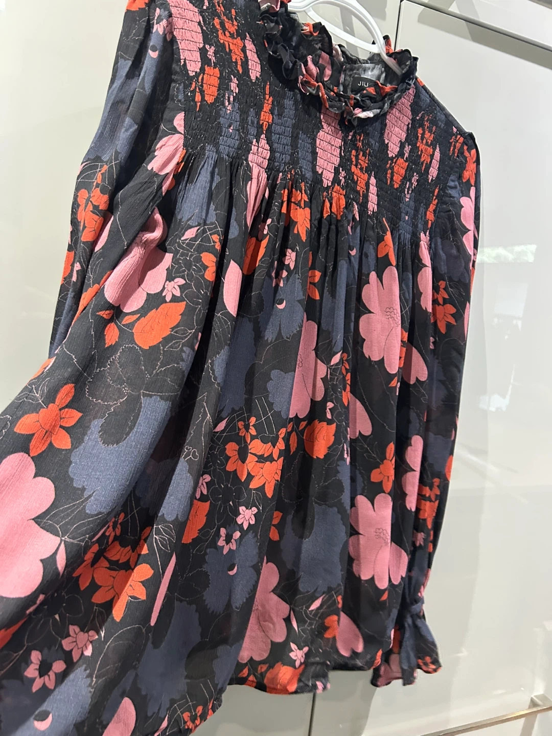 Gorgeous Jillian floral blouse with a smocked neck and ruffled details. It's made with a lightweight fabric and features long sleeves with ruffled cuffs. Perfect for adding a touch of flair to any outfit!