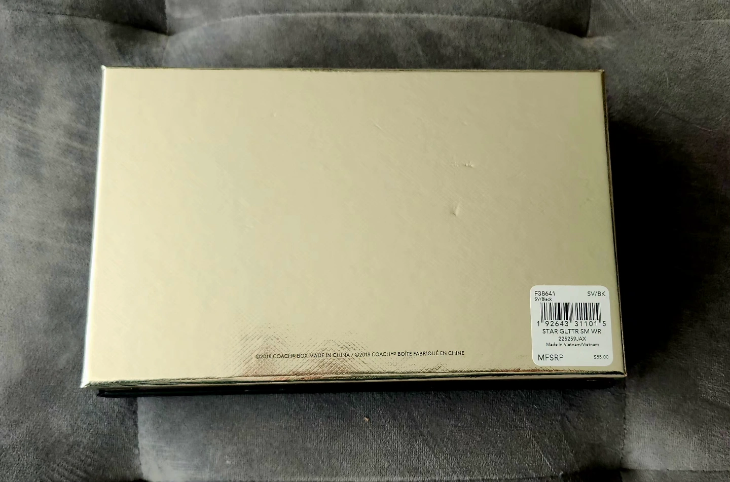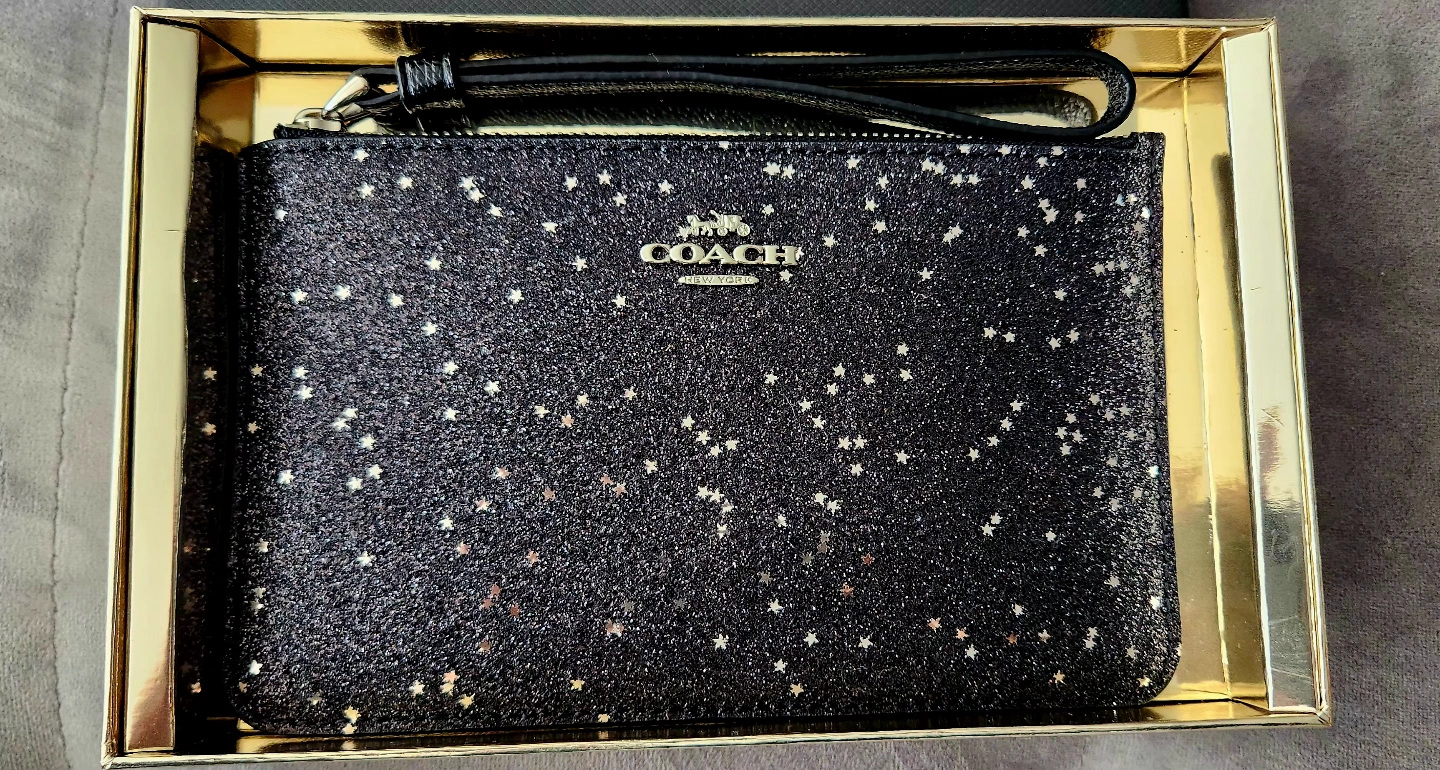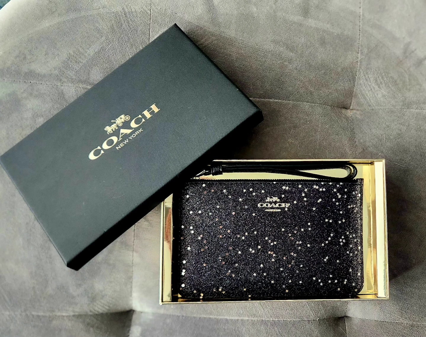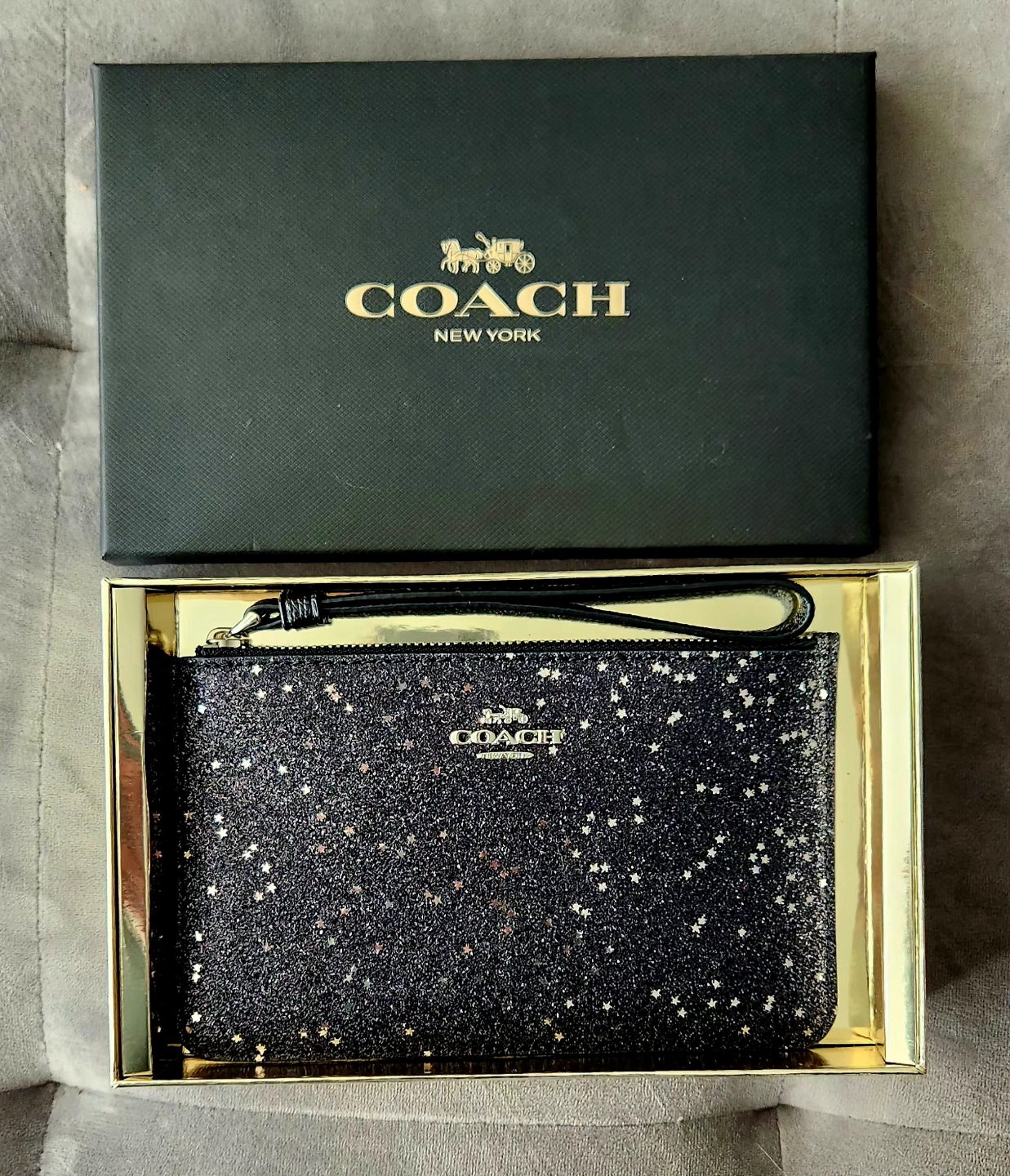 Coach's Glitter Collection Corner Zip Wristlet. Brand new in box. Featuring black glitter with silver star accent on one side and black leather on the other side. Zip top closure, wrist strap and fabric lining with 2 credit card slots inside. This handcrafted accessory was designed to hold small electronics including standard iPhone, Samsung Gallaxy, Blackberry and other mobile devices. Measures 7" long, 4.5" high and 0.5" wide (zipped closed). Original care papers etc. included.