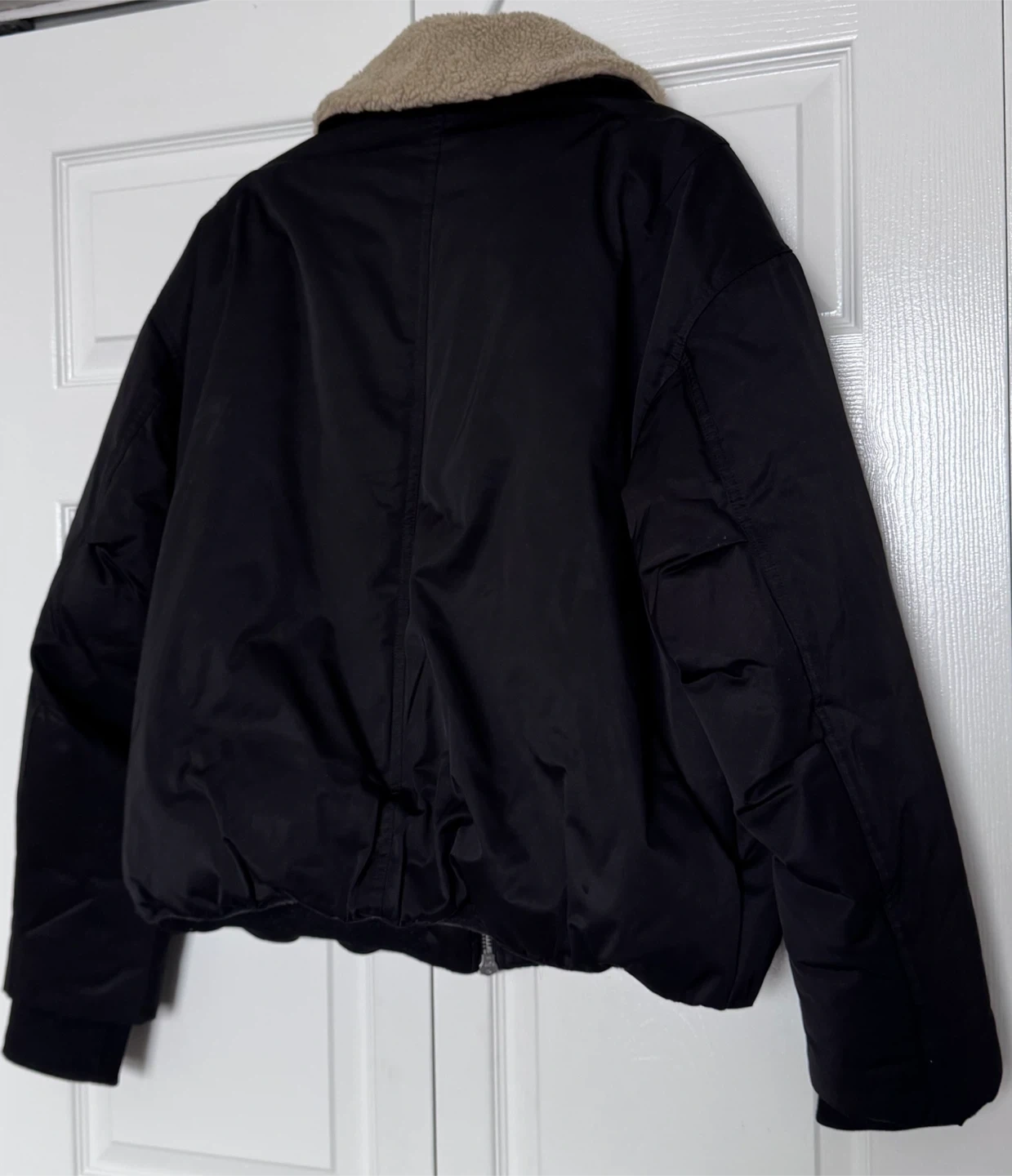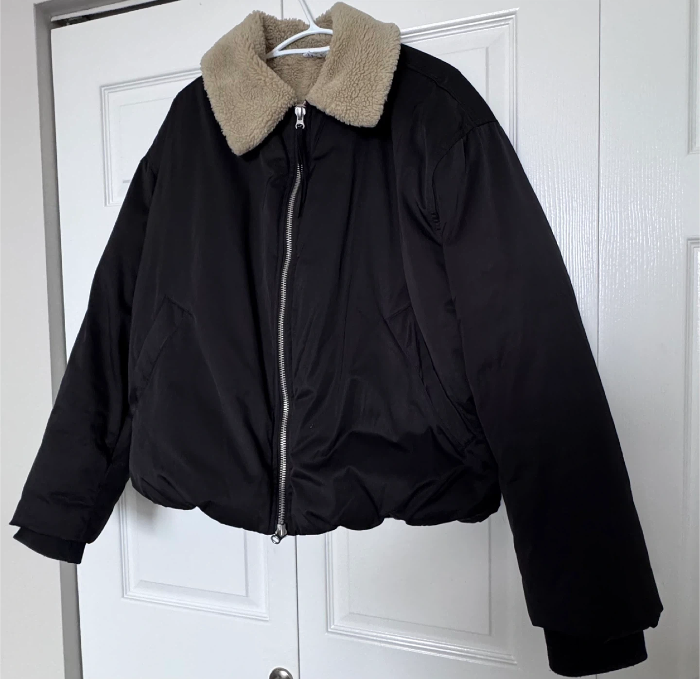 Selling a Zara black jacket, size medium. It features a cozy faux shearling collar, perfect for adding a touch of warmth and style to your outfits.