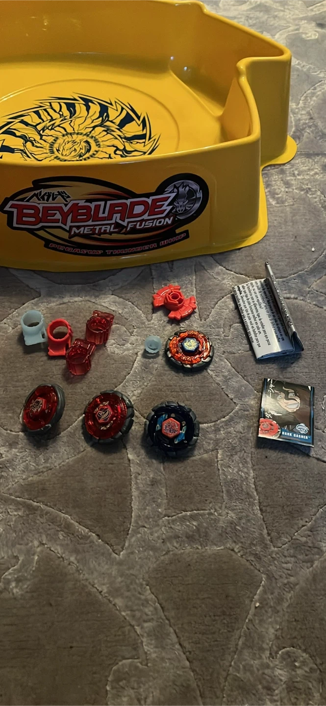 - 3 original metal beyblades + some extra spare parts to make a fourth