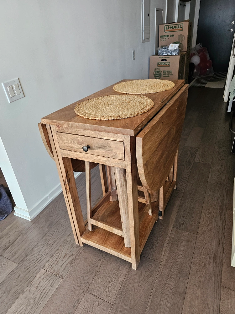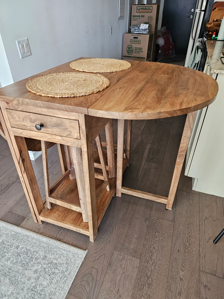 This wooden drop leaf kitchen island table comes with two matching stools. It features a convenient drawer for extra storage. The drop leaf design makes it adaptable for smaller spaces!