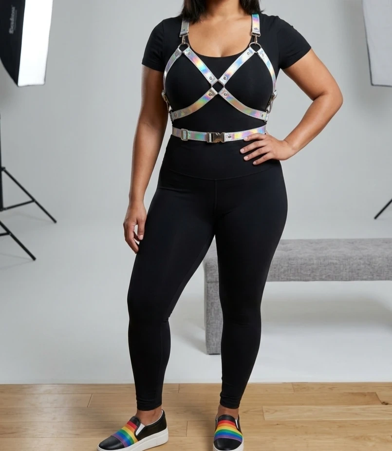 This holographic harness bra features adjustable straps and silver hardware. It's made from a shimmering, iridescent material. This accessory adds a unique flair to any outfit!