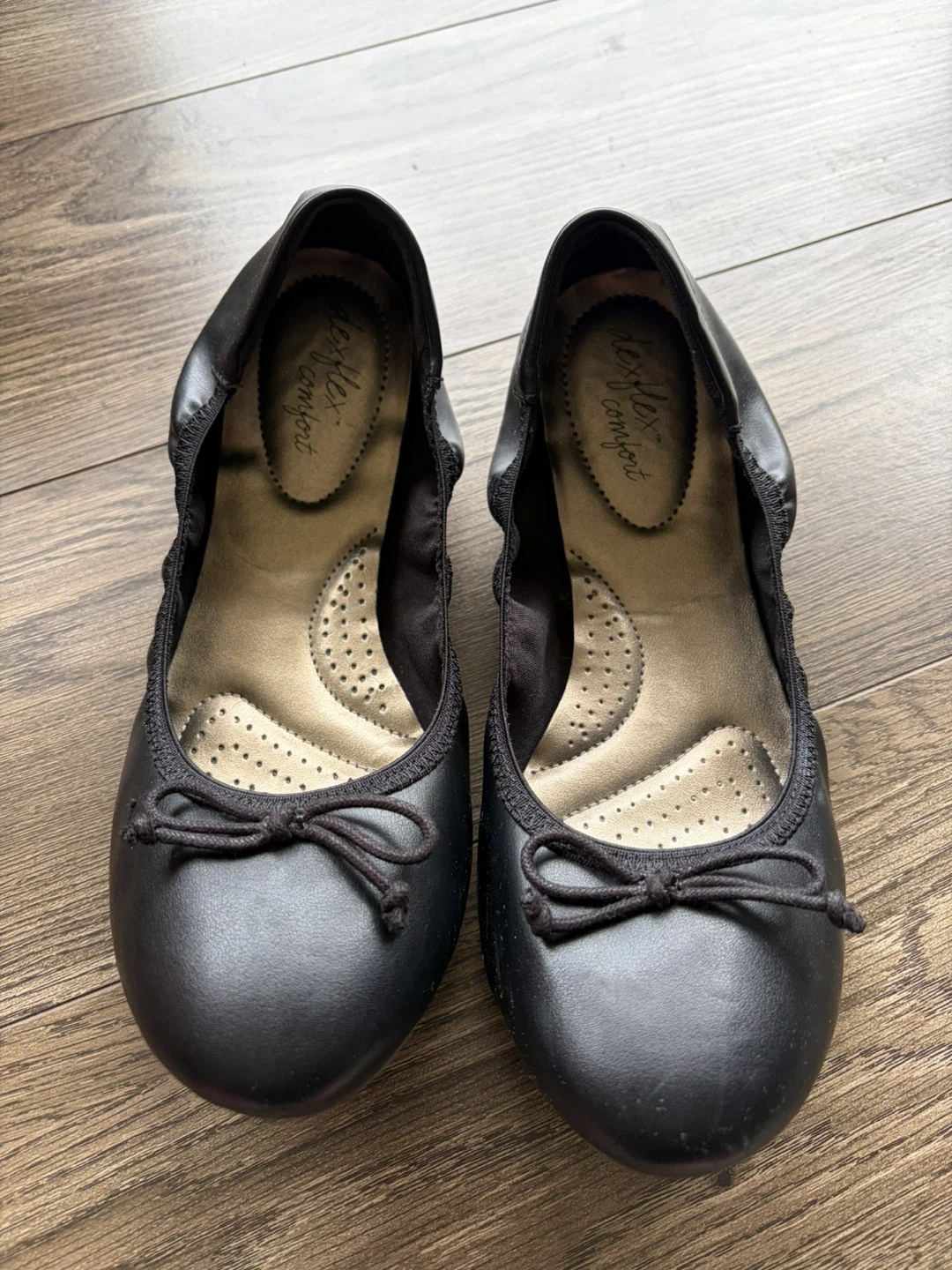 These DexFlex Comfort ballet flats are black. They feature a cushioned insole for comfort. These shoes are size 10W.
