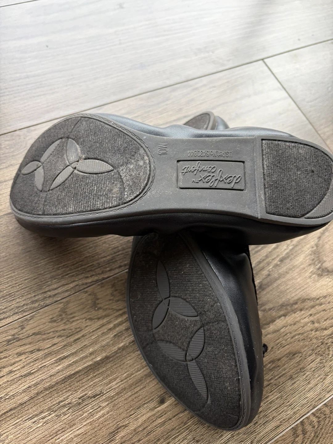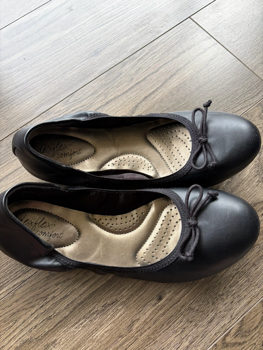 These DexFlex Comfort ballet flats are black. They feature a cushioned insole for comfort. These shoes are size 10W.