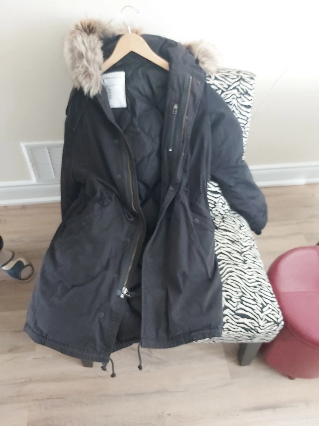 Black hooded parka with faux fur trim and a drawstring waist. This 'Military Edition' style is a size large. It's well-lined for warmth.