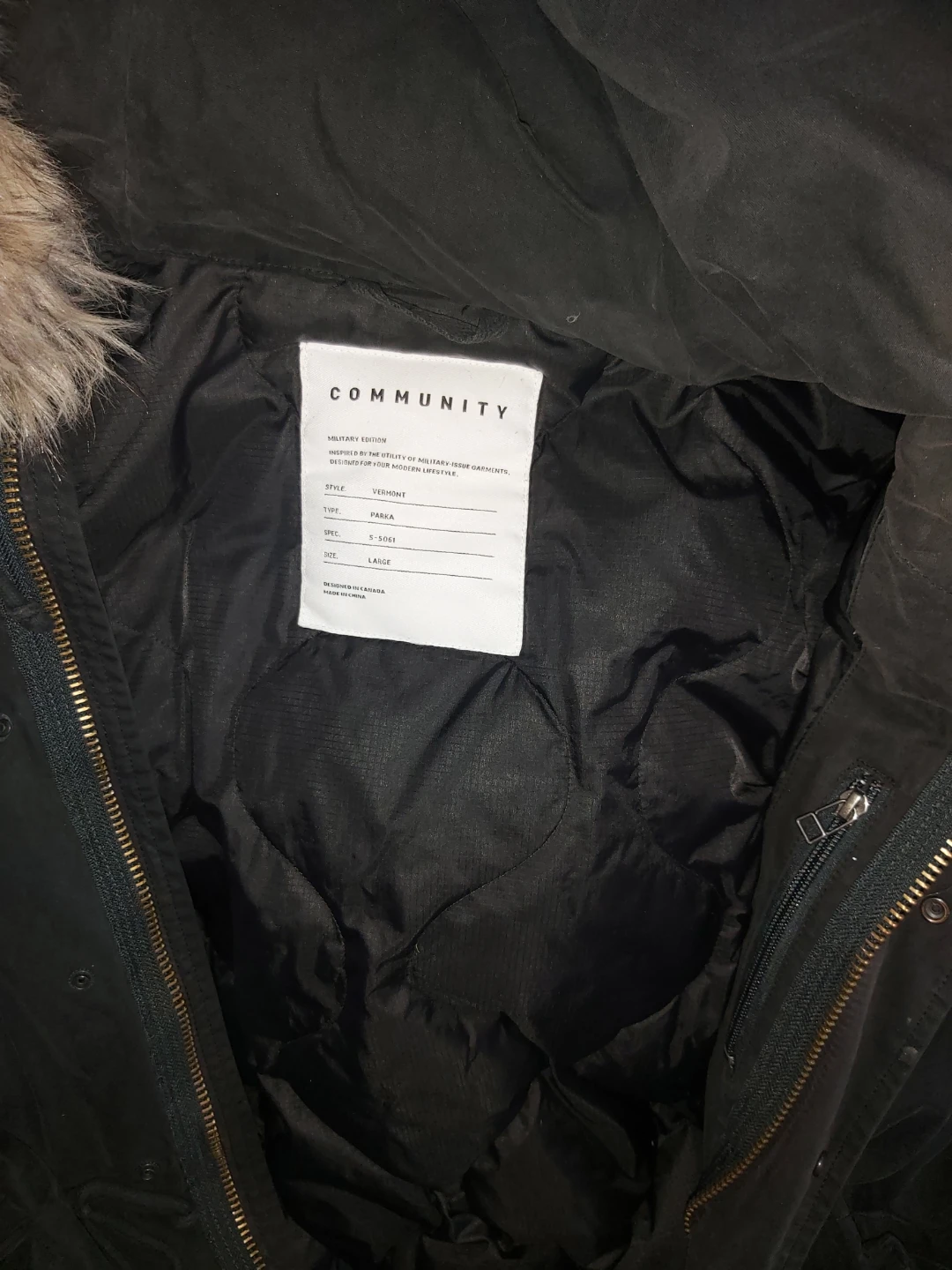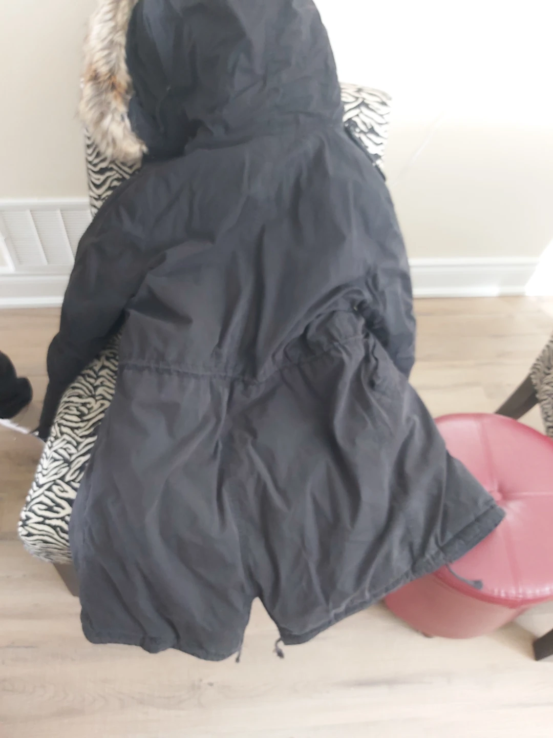 Black hooded parka with faux fur trim and a drawstring waist. This 'Military Edition' style is a size large. It's well-lined for warmth.