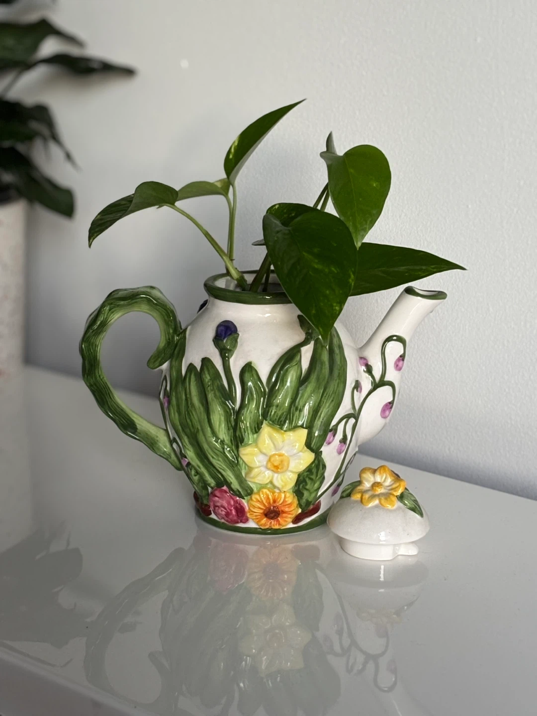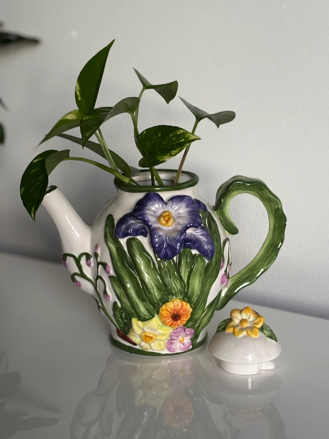 This ceramic teapot features a charming floral design with embossed flowers and leaves. It includes a matching lid. Perfect for serving tea, a decorative piece or a planter