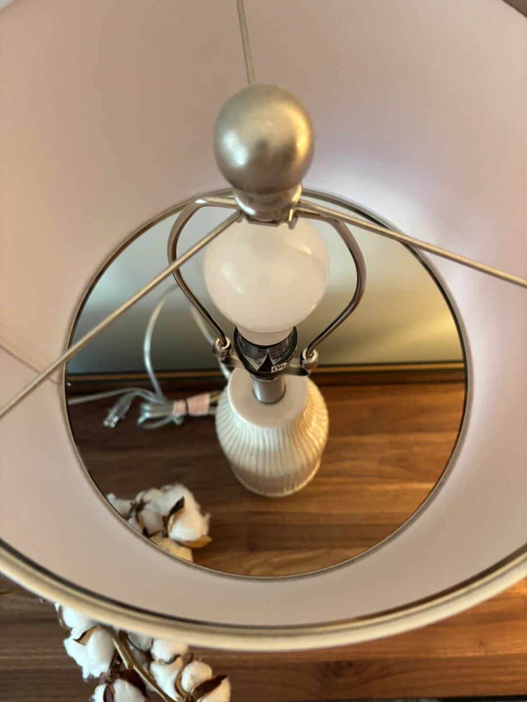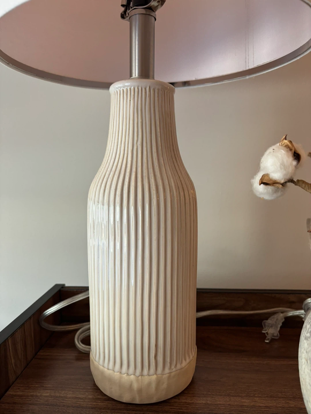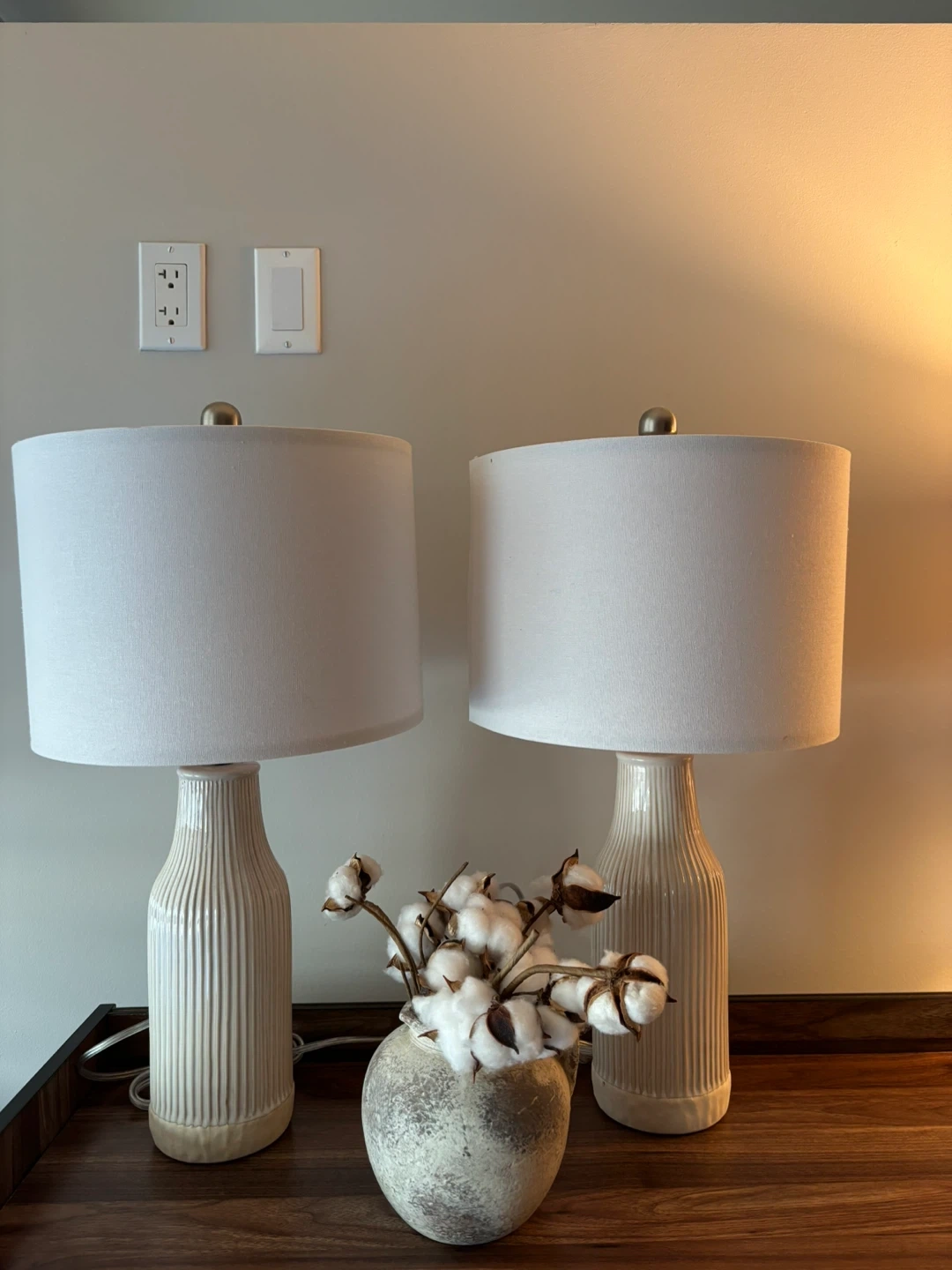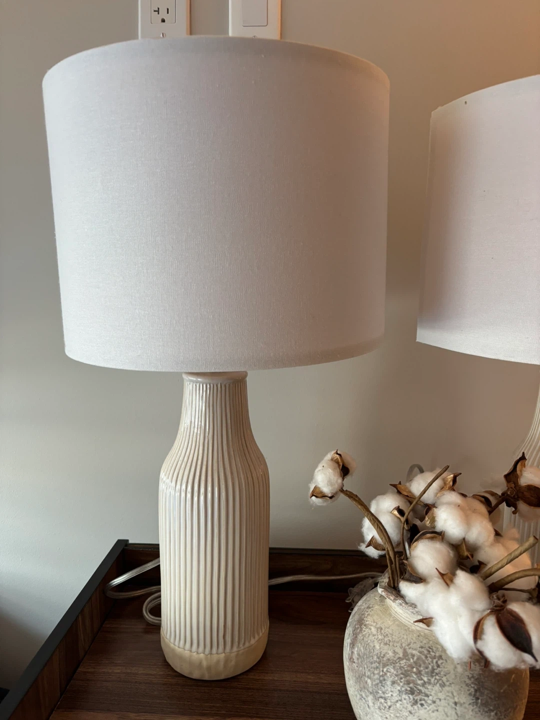 This listing is for a pair of ceramic table lamps. The bases have a ribbed texture and a cream-colored finish. Each lamp comes with a white fabric drum shade. These lamps are a great addition to any living room or bedroom decor. They provide a warm and inviting ambiance.