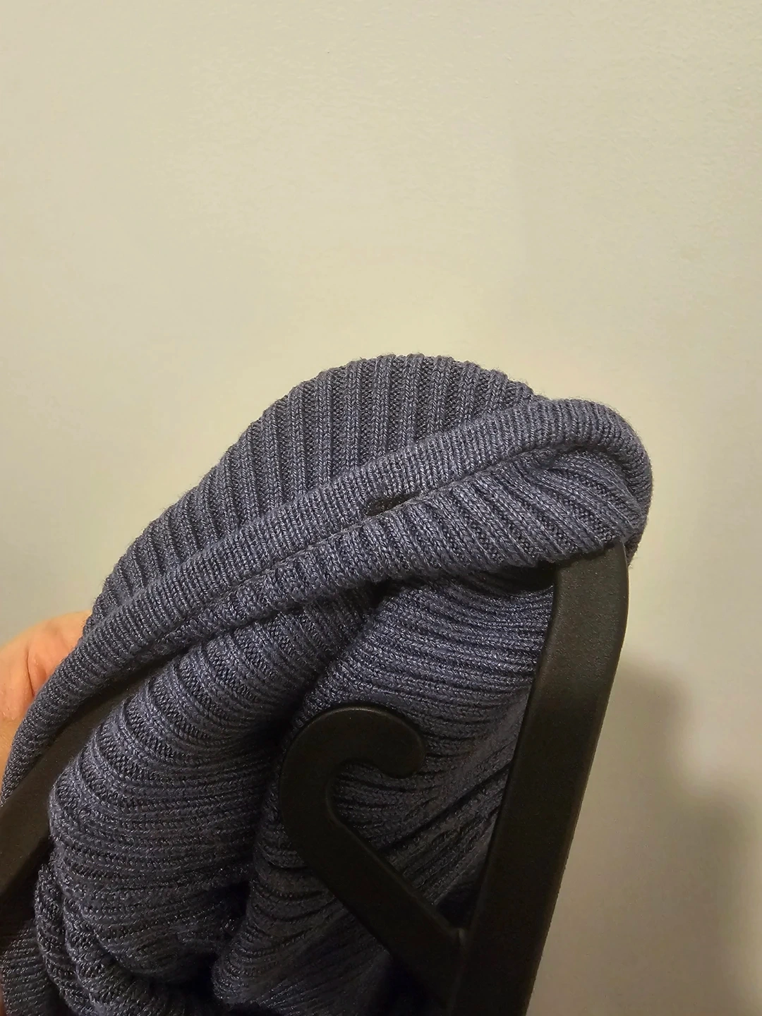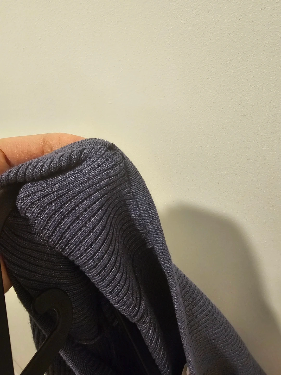 This is a stylish ribbed knit top in a dark blue colour. It features a flattering off-the-shoulder neckline and long sleeves. The material is a stretchy knit blend, ensuring a comfortable fit.