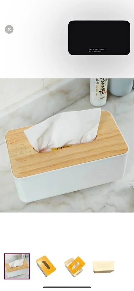 Stylish tissue holder. Wood lid is MDF material with wood design. Please note this does not cover a box of tissues, you need to take tissues out of the box. Measures L 8.25" x W 5" x H 3.75". Perfect condition. Would be great for baby wipes too! E transfer and porch pickup preferred 📍Pond Mills