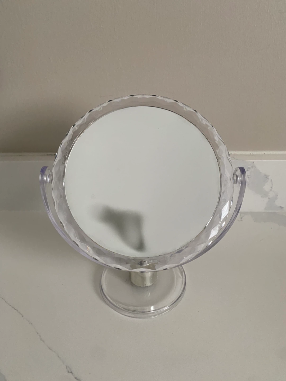 This is a clear vanity mirror. It has a rotating design for easy angling. Perfect for a vanity or dresser! Two side mirror, magnifying side and regular.