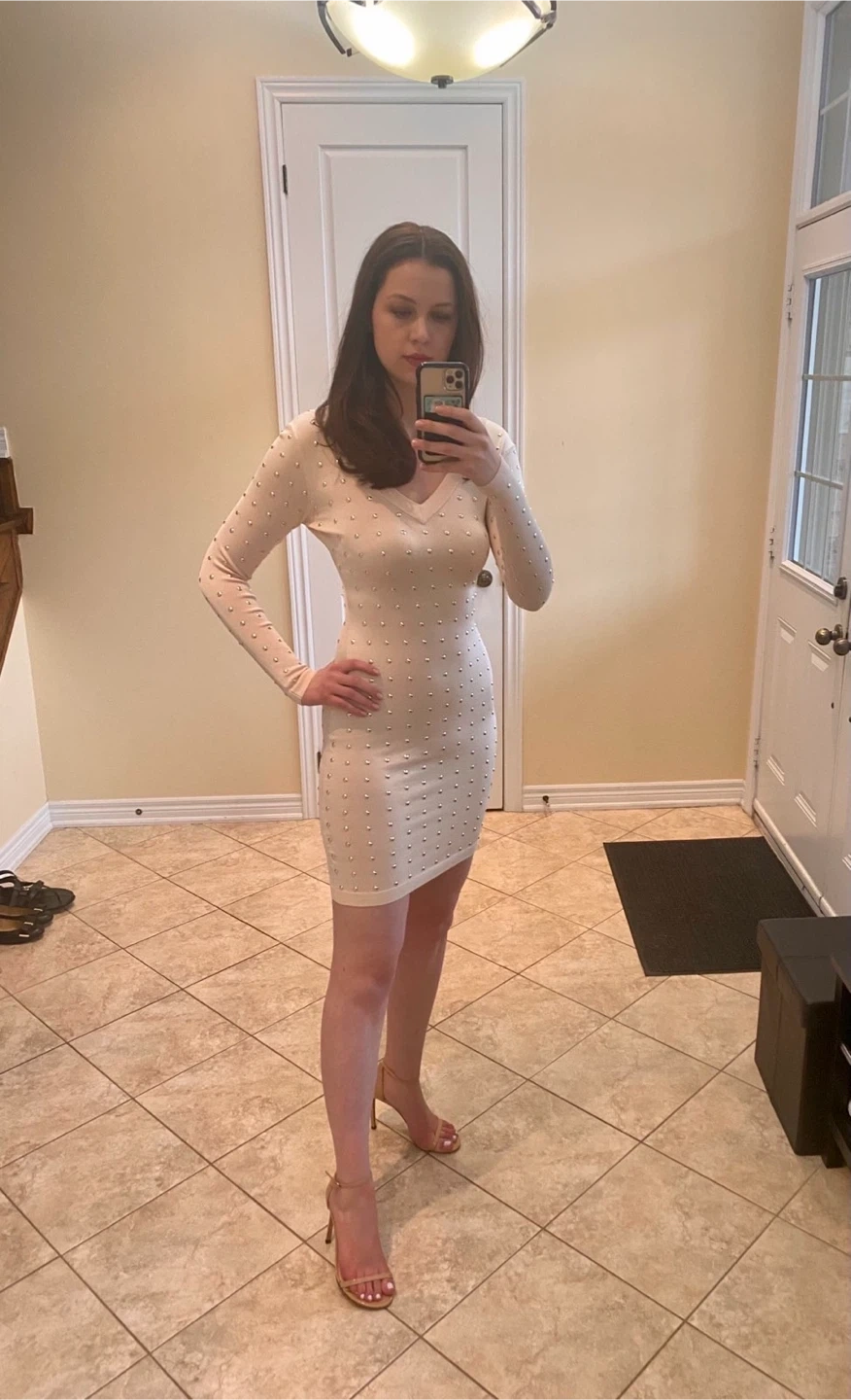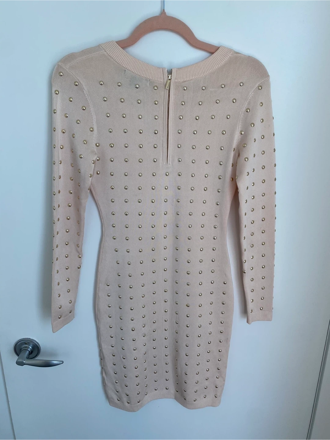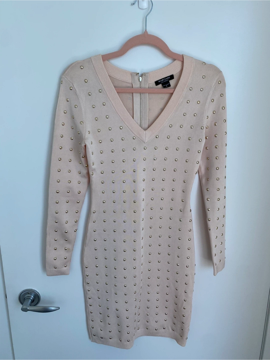 This is a long-sleeved, light pink knit dress from Guess. It's detailed with gold-tone studs all over. Features a V-neckline and a back zipper closure.