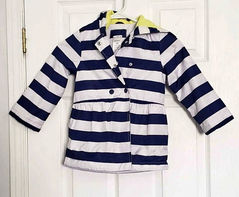 Toddler girls Carters striped spring rain coat jacket. Hooded and fleece lined. Size 4T. Minor stain on left shoulder. Cash only. If listing is up, it's available.