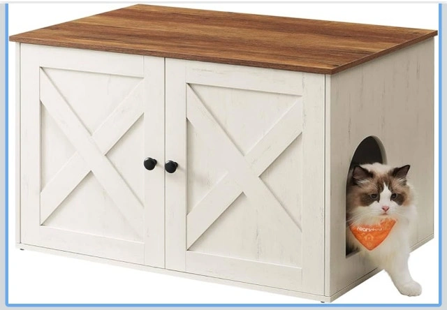 This is a brand new Feandrea cat litter box enclosure (model PCL002P01) in honey brown and rustic white. It's designed to keep your cat's litter box hidden and can also function as a stylish nightstand or side table. It features a cat-sized entrance and double doors for easy cleaning. Made from durable manufactured wood, it's built to last and will add a nice touch to your home. If the ad is up, it's available! Cash and cashless payments are accepted.