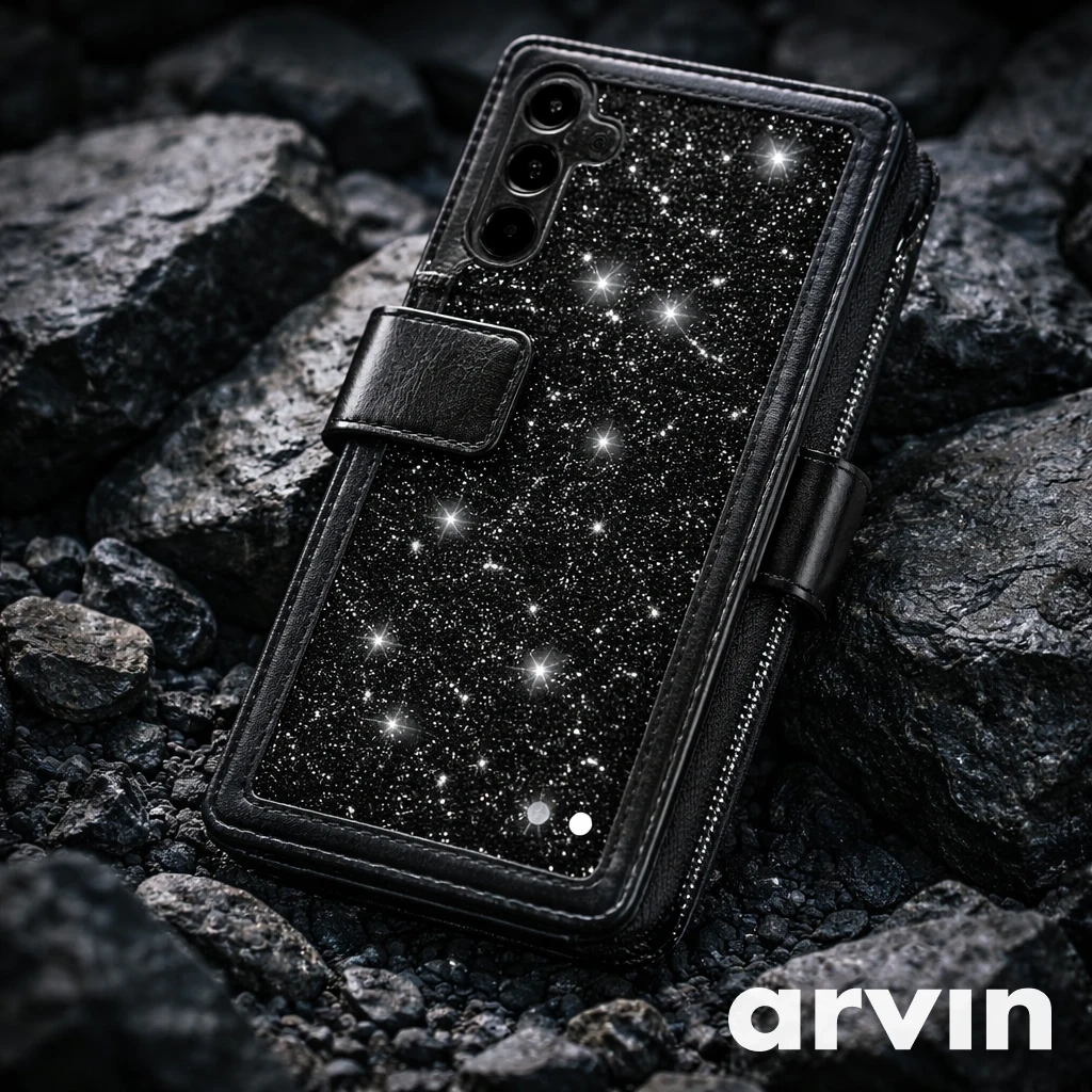 This is an Arvin phone case with a glittery black finish. It features a secure strap closure and a wallet-style design. It's made with durable materials to protect your phone.